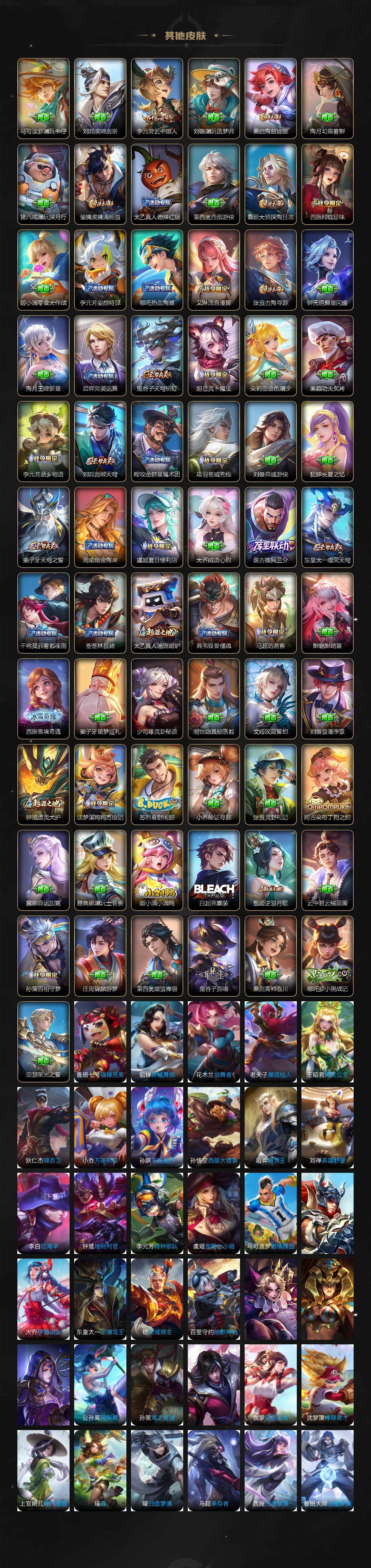 【限定皮肤】:蒙犽顽岩魄,蔡文姬夏日便利店,大乔绒语心约,虞姬夏日便利店,姜子牙天穹之誓,李白谪仙醉月,狄仁杰阴阳师,赵云皇家上将,妲己时之彼端,孙尚香蔷薇恋人,马可波罗暗影游猎,狄仁杰魔术师,项羽海滩派对,安琪拉魔法小厨娘,李元芳云中旅人,杨玉环遇见飞天,女娲朔望之晖,诸葛亮时雨天司,大乔时之奇旅,公孙离玉兔公主,裴擒虎擒涛扼浪,瑶山海碧波行,云中君纤云弄巧,嫦娥拒霜思,西施玲珑珍味,西施至美乘鲤谣,鲁班大师探海日志,桑启海盐诗旅,戈娅驭风魔法,艾琳流音漫舞,司空震地狱燃心,阿古朵江河有灵,张良古海寻踪,高渐离燃音魔法,妲己灵卜魔法,鬼谷子天穹祈灯,貂蝉曦玄引,鲁班七号蔬乡物语,李元芳蔬乡物语,刘邦剑破天穹,上官婉儿群星魔术团,程咬金群星魔术团,镜青焰无极,项羽苍威无极,刘备异域游侠,周瑜熔金海岸