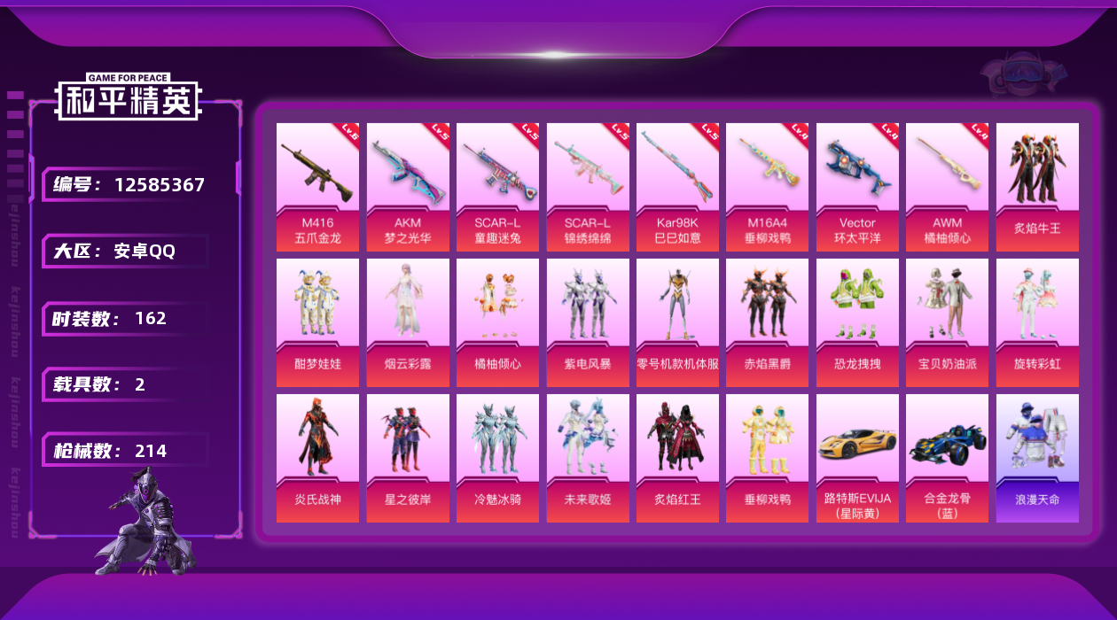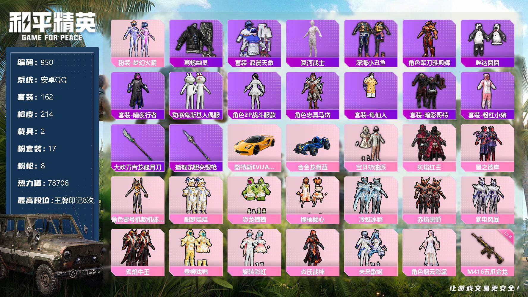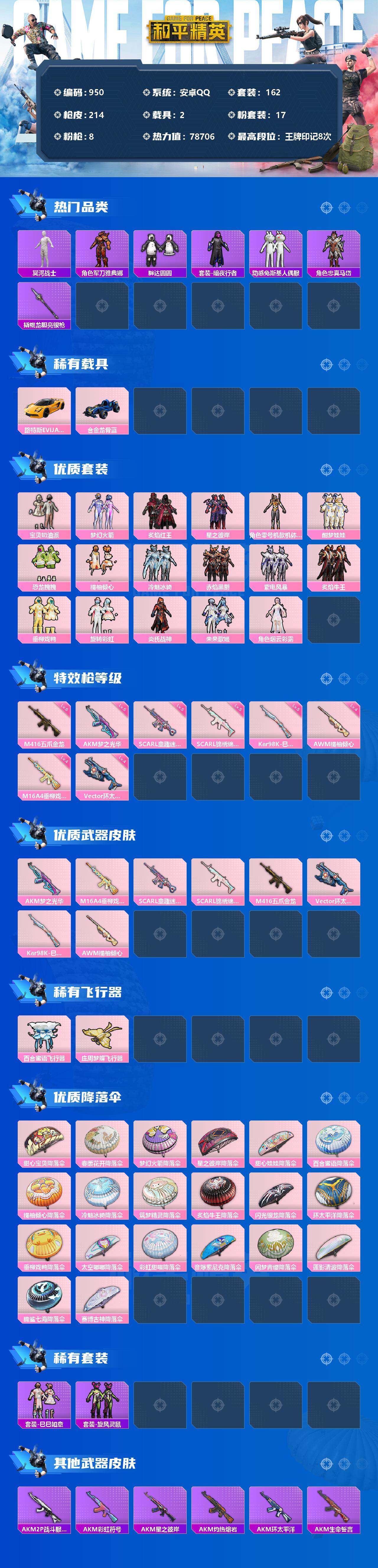 [12585367]安卓 手Q-17粉装-8特效枪-2载具-2粉色飞行器-78706热力值-8王牌印记-162套装-214枪皮 【热门品类】:粉装-梦幻火箭,套装-寒蝎幽灵,套装-浪漫天命,套装-冥河战士,套装-深海小丑鱼,角色-军刀雅典娜,套装-胖达圆圆,套装-暗夜行者,套装-动感兔斯基人偶服,角色-2P战斗服款,角色-忠真马岱,套装-龟仙人,套装-暗影哥特,套装-粉红小猪,大砍刀-青龙偃月刀,撬棍-龙胆亮银枪 【粉色载具】:路特斯EVIJA(星际黄),合金龙骨(蓝) 【粉色套装】:粉装-宝贝奶油派,粉装-梦幻火箭,粉装-炙焰红王,粉装-星之彼岸,角色-零号机款机体服,粉装-酣梦娃娃,粉装-恐龙拽拽,粉装-橘柚倾心,粉装-冷魅冰骑,粉装-赤焰黑爵,粉装-紫电风暴,粉装-炙焰牛王,粉装-垂柳戏鸭,粉装-旋转彩虹,粉装-炎氏战神,粉装-未来歌姬,角色-烟云彩露 【粉色枪皮等级】:AKM-梦之光华(五级),M16A4-垂柳戏鸭(四级),SCAR-L-童趣迷兔(五级),SCAR-L-锦绣绵绵(五级),M416-五爪金龙(六级),Vector-环太平洋(四级),Kar98K-巳巳如意(五级),AWM-橘柚倾心(四级) 【粉色枪皮】:AKM-梦之光华,M16A4-垂柳戏鸭,SCAR-L-童趣迷兔,SCAR-L-锦绣绵绵,M416-五爪金龙,Vector-环太平洋,Kar98K-巳巳如意,AWM-橘柚倾心 【粉色飞行器】:百合蜜语飞行器,庄周梦蝶飞行器 【粉色降落伞】:甜心宝贝降落伞,春暖花开降落伞,梦幻火箭降落伞,星之彼岸降落伞,甜心娃娃降落伞,百合蜜语降落伞,橘柚倾心降落伞,冷魅冰骑降落伞,筑梦精灵降落伞,炙焰牛王降落伞,闪光银龙降落伞,环太平洋降落伞,垂柳戏鸭降落伞,太空嘟嘟降落伞,彩虹甜喵降落伞,音爆索尼克降落伞,闲梦青缨降落伞,莲影清波降落伞,脆鲨七海降落伞,赛博古神降落伞 【稀有套装】:套装-龟仙人,套装-巳巳如意,套装-旋风灵鼠 【稀有枪皮】:AKM-2P战斗服款,AKM-彩虹符号,AKM-星之彼岸,AKM-灼热熔岩,AKM-环太平洋,AKM-生命誓言,AKM-破晓战魂,AKM-筑梦精灵,AKM-缤纷海域,AKM-虎虎生威,AKM-霓虹街区,AKM-龙的传人,M16A4-冥河战士,M16A4-幻世战舞者,M16A4-甜心亚梦,SCAR-L-玉兔迎春,SCAR-L-红色方程式,M41