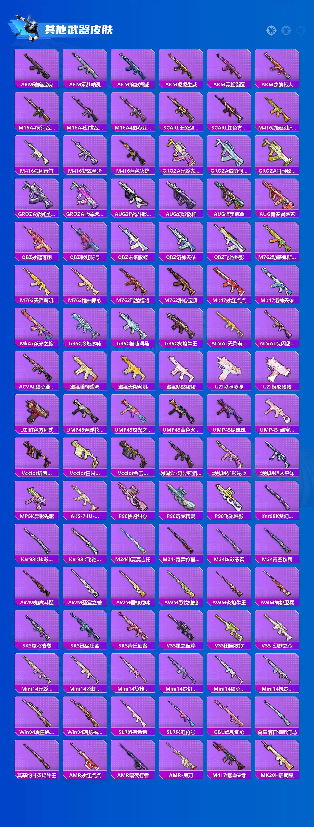【稀有枪皮】:AKM-2P战斗服款,AKM-彩虹符号,AKM-星之彼岸,AKM-灼热熔岩,AKM-环太平洋,AKM-生命誓言,AKM-破晓战魂,AKM-筑梦精灵,AKM-缤纷海域,AKM-虎虎生威,AKM-霓虹街区,AKM-龙的传人,M16A4-冥河战士,M16A4-幻世战舞者,M16A4-甜心亚梦,SCAR-L-玉兔迎春,SCAR-L-红色方程式,M41
