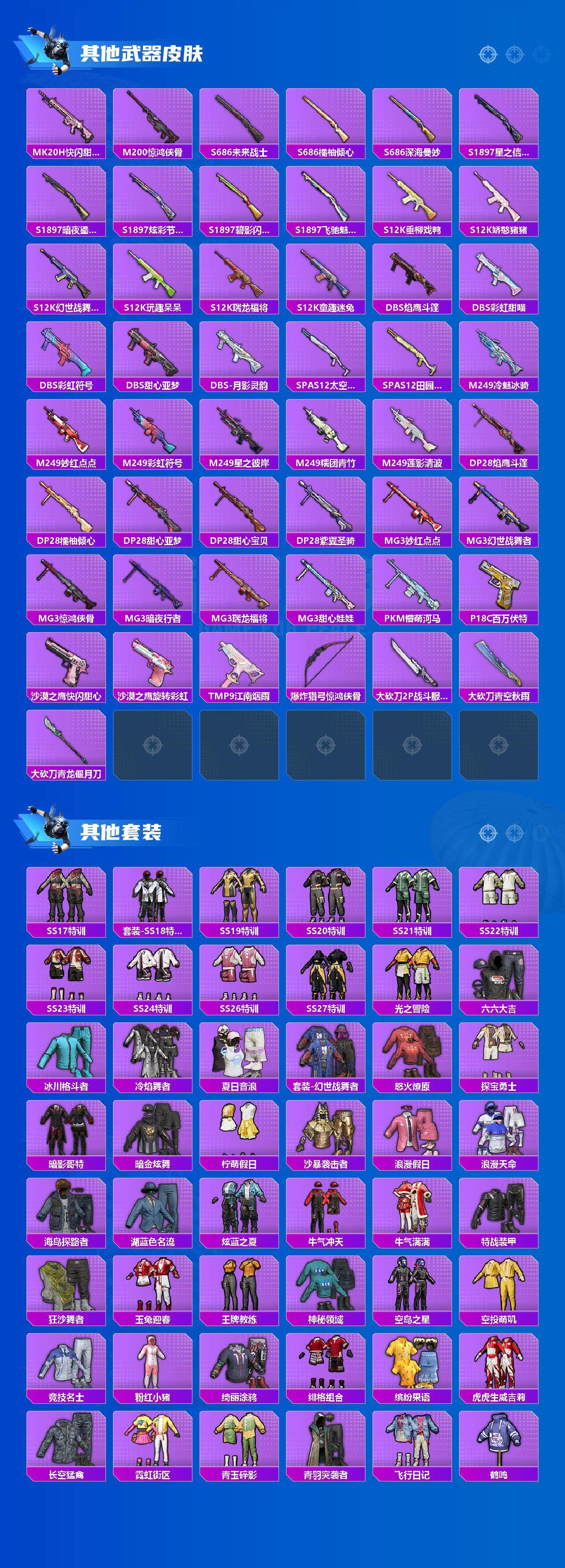 - [11609140]4粉装 9特效枪 5印记 可二次 可修改实名 优质装备:奇异狩猎者,宝贝奶油派,AKM绿萝繁花,SCAR-L-锦绣绵绵,M416电玩时刻,七级PKM-守护天翼,PKM-守护天翼,GROZA-镜光银凌,AUG-暖羊咩咩,星穹咏叹调,MK14-甜梦熊击,狂魅哈莉,Kar98K-巳巳如意 热门装扮:飒粉甜心,大橘为重,呆萌铁蟹 稀有枪皮:DP-28-豹影疾电 五级特效枪:五级GROZA-镜光银凌,五级Kar98K-巳巳如意,五级MK14-甜梦熊击,五级AUG-暖羊咩咩,五级M416-电玩时刻,五级SCAR-L-锦绣绵绵,五级AKM-绿萝繁花 一级特效枪:一级DP-28-豹影疾电 紫色装扮:田园牧歌,轻风白浪,和煦暖阳,SS22特训,飞狐塔尔斯,SS23特训,幻彩翩翩,妙红点点,娇憨猪猪,萌趣咩咩,SS21特训,SS31特训套装,人气偶像,冰川特警,冷焰舞者,霓虹热舞,SS30特训套装,云朵鹅,雪绒豹,SS33特训套装,混沌火种,SS20特训,SS15特训,SS16特训,SS13特训,治愈之星,科技之星,SS14特训,萌趣颜团子,特种颜团子,英勇保护者,吉莉礼服,甜心亚梦,虚音幻奏,瑞龙福将,团圆交子,SS17特训,SS18特训,野性战心,长空猛禽,荣耀,荧惑魅影,蓝彩潮人,虎虎生威吉莉,街头潮人,飞行日记,龙腾端午,骑行爱好者,魅力单车,鹤鸣,麻辣教官,龙的传人,冰河战士,龙魂突击队,香桃花海,极地朋克,柠萌假日,格斗先锋,海岛探路者,涂山之恋,深蓝色名流,暗黑骑手,滨海假日,幻世战舞者,怒火燎原,探宝勇士,滨海厨神,白熊同盟,白色伏地魔,破晓战魂,竞技达人朋克,王牌教练,牛气冲天,热血青春,牛气满满,特战装甲,星途旅人,纯真浪花,热情海星,SS28特训,冰公主,鱼渊荷华,玉兔迎春,燕燕于飞,巳巳如意,竞技名士,街头风暴,怀庆长公主,惊鸿侠骨,神气柴柴,懵萌河马,SS24特训(SS24特训套装),萤火魅影(套装-荧惑魅影),SS25特训,绝对偶像,锦衣飞扬,粉红小猪,焰鹰斗篷,幻羽潜行,SS27特训,小丑鱼,SS26特训,春光漫游,快闪甜心,智谋强哥,核芯基因,大橘大利,星影赞美诗,抹茶蜜豆,智慧之神,SS10特训,SS11特训,蓝冰羽,紫幽梦,SS32特训服(SS32特训套装),青玉碎影,绯格组合,萌黄之夏,白糯汤圆,蓝调潮人,光之冒险,海上生明月 优质战备:星梦奇缘