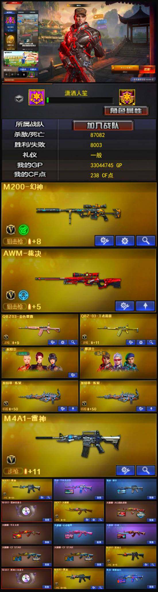 【热门武器】:QBZ03-金色蔷薇,M200-幻神,修罗-古蛇迷踪,M4A1-黑骑士,加特林-炼狱*2,沙鹰-修罗*2
