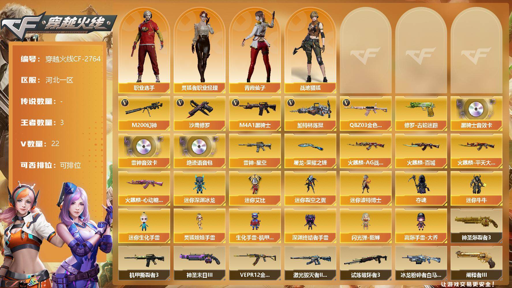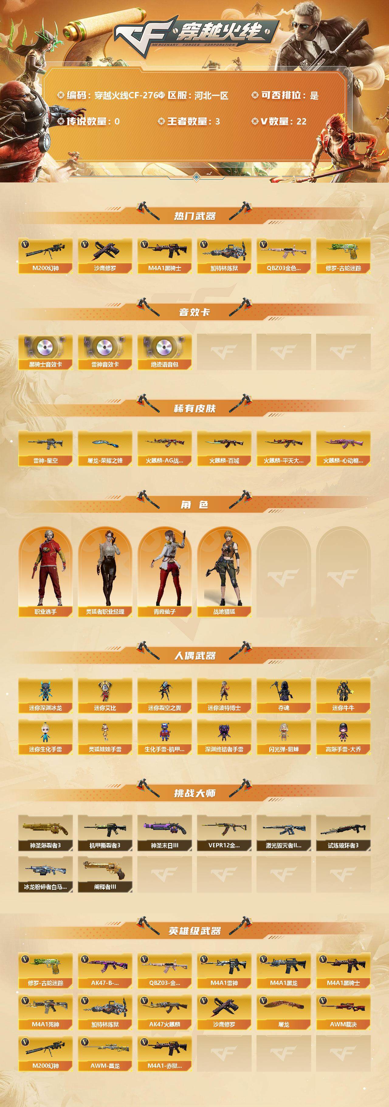 [12586498]河北一区-22V-3王者-0炫金 【热门武器】:QBZ03-金色蔷薇,M200-幻神,修罗-古蛇迷踪,M4A1-黑骑士,加特林-炼狱*2,沙鹰-修罗*2 【音效卡】:M4A1-雷神音效卡,M4A1-黑骑士音效卡,绝迹语音包 【稀有皮肤】:雷神-星空,火麒麟-AG战队皮肤,火麒麟-平天大圣,火麒麟-百城,火麒麟-心动糖果,屠龙-荣耀之锋 【角色】:灵狐者-职业经理,战地猎狐,职业选手,青霞仙子 【人偶武器】:迷你深渊冰龙,迷你艾比,迷你裂空之翼*4,迷你波特博士*2,夺魂,迷你牛牛*2,迷你生化手雷,灵狐娃娃手雷,生化手雷-机甲核心*2,深渊终结者手雷,闪光弹-貂蝉,高爆手雷-大乔 【挑战大师】:神圣爆裂者III*2,机甲撕裂者III,神圣爆裂者-末日III,阐释者III*2,试炼破坏者III,VEPR-12-金魔,激光毁灭者III-白马银枪,冰龙粉碎者-白马银枪 【英雄级武器】:QBZ03-金色蔷薇,M4A1-雷神*2,M4A1-黑龙,M4A1-黑骑士,M4A1-死神,加特林-炼狱*2,AK47-火麒麟,AWM-裁决,M200-幻神,AK47-B-常胜将军,AWM-昌龙,M4A1-赤狱骑士,修罗-古蛇迷踪,沙鹰-修罗*2,屠龙*2 【特殊枪械】:1黑骑士,2炼狱