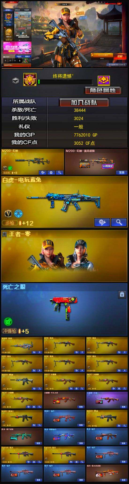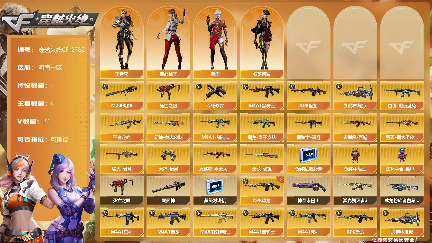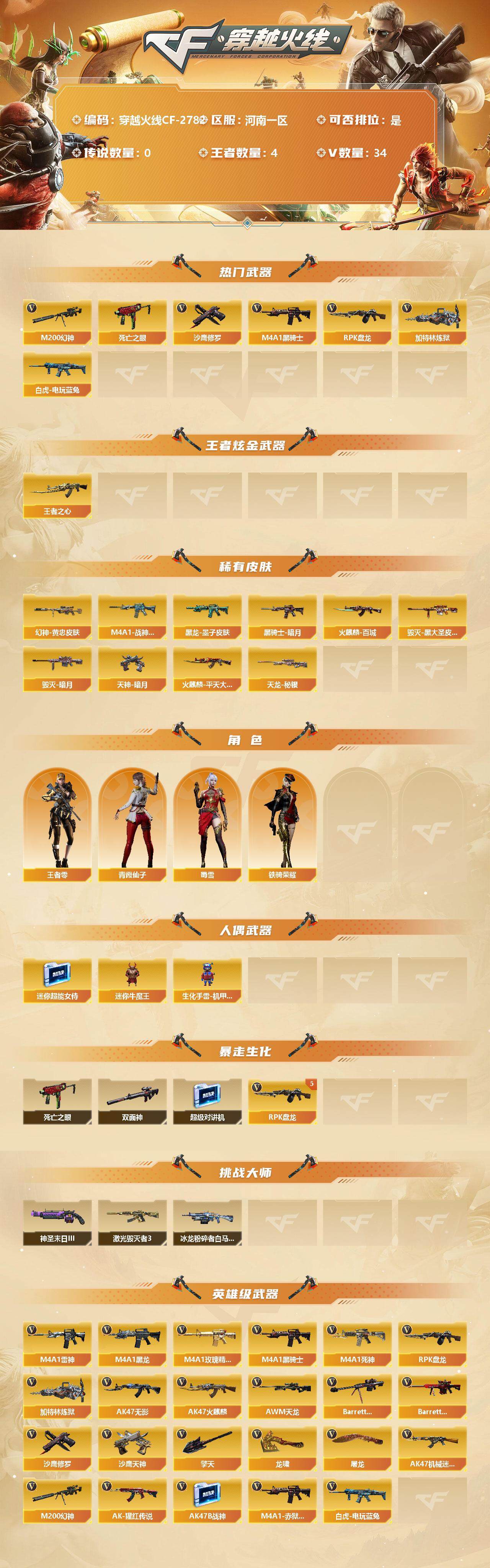 [12586749]河南一区-34V-4王者-0炫金 【热门武器】:M200-幻神,死亡之眼,白虎-电玩蓝兔,M4A1-黑骑士,RPK-盘龙*5,加特林-炼狱,沙鹰-修罗*2 【王者炫金武器】:王者之心 【稀有皮肤】:M200-幻神-黄忠皮肤,M4A1-战神赵云,火麒麟-平天大圣*2,火麒麟-百城,黑骑士-暗月,黑龙-墨子皮肤,毁灭-暗月*3,毁灭-黑大圣皮肤,天龙-秘银,天神-暗月*3 【角色】:王者-零,蜀雪,铁骑荣耀,青霞仙子 【人偶武器】:迷你超能女侍,迷你牛魔王,生化手雷-机甲核心 【暴走生化】:死亡之眼,双面神,超级对讲机 【挑战大师】:神圣爆裂者-末日III*2,激光毁灭者III,冰龙粉碎者-白马银枪*2 【英雄级武器】:白虎-电玩蓝兔,M4A1-雷神,M4A1-黑龙,M4A1-玫瑰精灵,M4A1-黑骑士,M4A1-死神,RPK-盘龙*5,加特林-炼狱,AK47-无影,AK47-火麒麟*3,AWM-天龙,Barrett-毁灭*2,Barrett-极光,AK47-机械迷城,M200-幻神,AK-47-猩红传说,AK47-B-战神*2,M4A1-赤狱骑士,沙鹰-天神,沙鹰-修罗*2,擎天,龙啸,屠龙*2 【特殊枪械】:1黑骑士,5盘龙,1炼狱