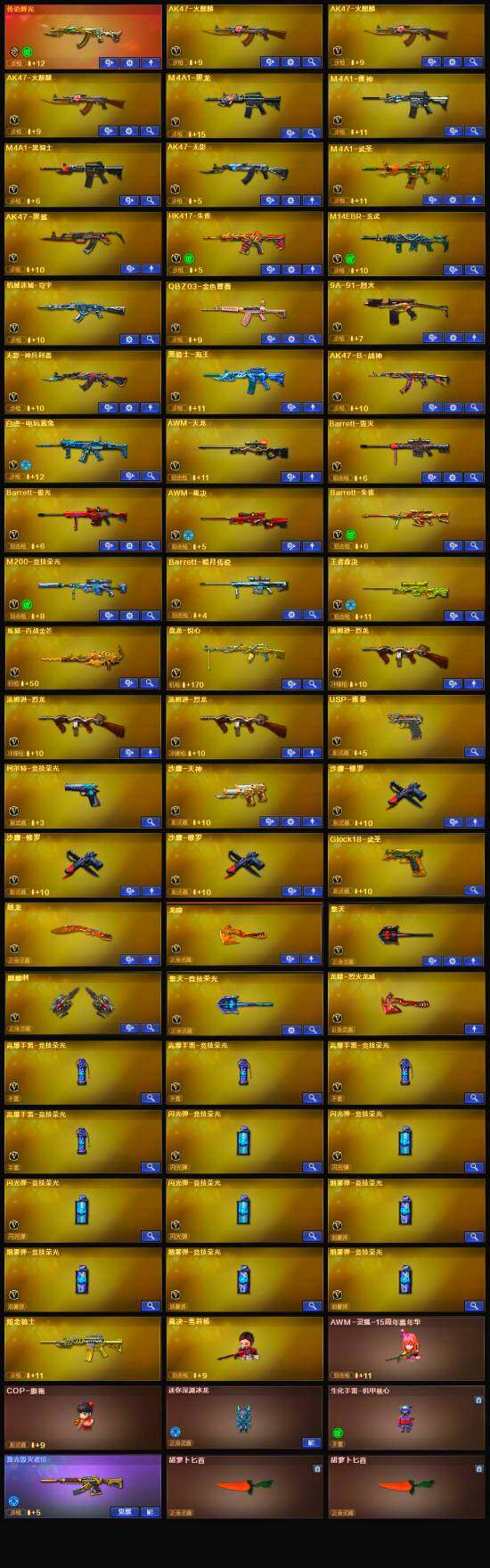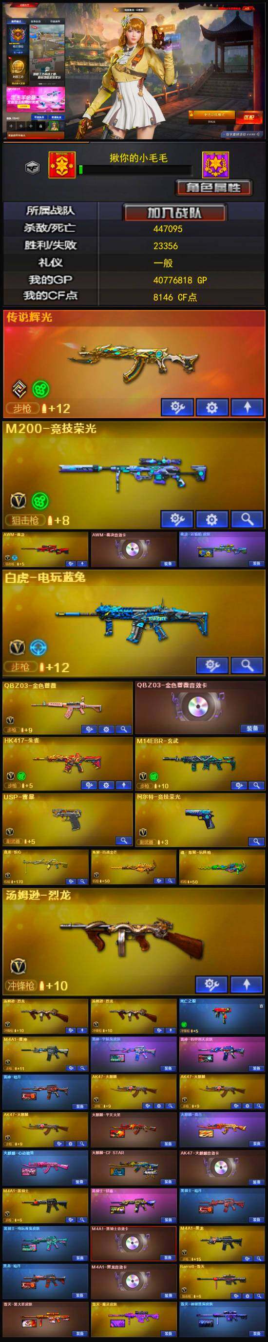 【热门武器】:传说辉光,QBZ03-金色蔷薇,M14EBR-玄武,HK417-朱雀,M200-竞技荣光,死亡之眼,白虎-电玩蓝兔,M4A1-黑骑士,汤姆逊-烈龙*3,裁决-雪莉杨,USP-雷暴,沙鹰-修罗*3