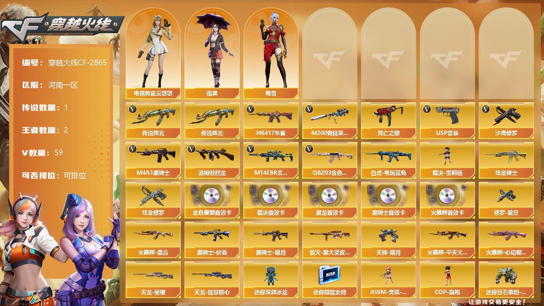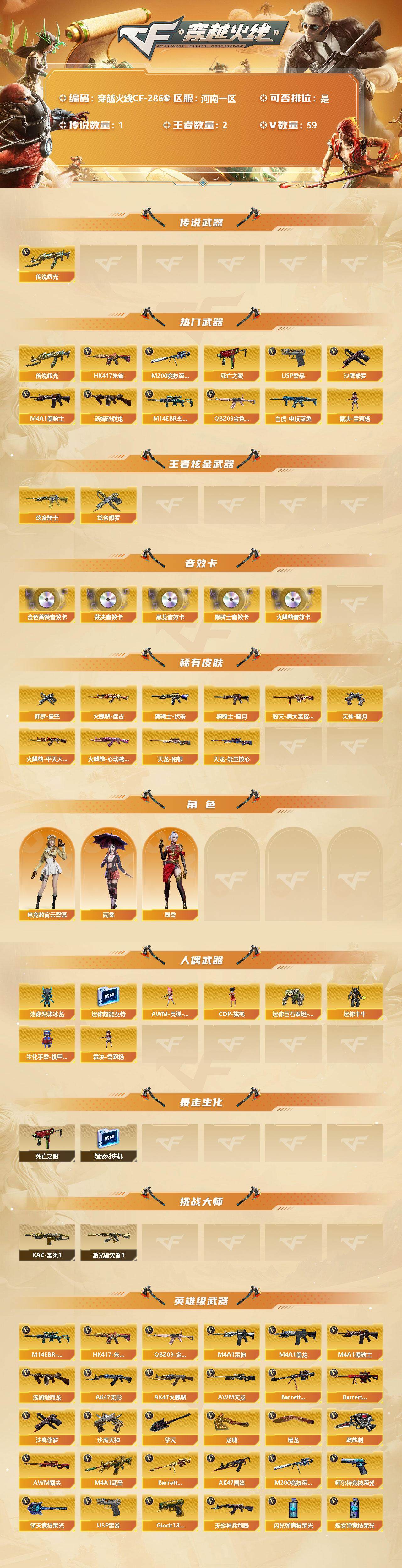 [12586986]河南一区-59V-2王者-2炫金 【传说武器】:传说辉光 【热门武器】:传说辉光,QBZ03-金色蔷薇,M14EBR-玄武,HK417-朱雀,M200-竞技荣光,死亡之眼,白虎-电玩蓝兔,M4A1-黑骑士,汤姆逊-烈龙*3,裁决-雪莉杨,USP-雷暴,沙鹰-修罗*3 【王者炫金武器】:炫金骑士,炫金修罗 【音效卡】:AK47-火麒麟音效卡,M4A1-黑龙音效卡,M4A1-黑骑士音效卡,QBZ03-金色蔷薇音效卡,AWM-裁决音效卡 【稀有皮肤】:火麒麟-平天大圣,火麒麟-盘古,火麒麟-心动糖果,黑骑士-暗月,黑骑士-伏羲,毁灭-黑大圣皮肤,天龙-秘银,天龙-能量核心,修罗-星空,天神-暗月 【角色】:雨棠,电竞教官-云悠悠,蜀雪 【人偶武器】:裁决-雪莉杨,AWM-灵狐-15周年嘉年华,COP-旗袍,迷你深渊冰龙,迷你超能女侍,迷你巨石泰坦-魔花研究所,迷你牛牛,生化手雷-机甲核心 【暴走生化】:死亡之眼,超级对讲机 【挑战大师】:KAC-圣炎切割者III,激光毁灭者III 【英雄级武器】:M200-竞技荣光,柯尔特-竞技荣光,擎天-竞技荣光,高爆手雷-竞技荣光*4,烟雾弹-竞技荣光*4,闪光弹-竞技荣光*4,USP-雷暴,M4A1-武圣,Glock18-武圣,QBZ03-金色蔷薇,M14EBR-玄武,HK417-朱雀,白虎-电玩蓝兔,无影-神兵利器,M4A1-雷神,M4A1-黑龙,M4A1-黑骑士,汤姆逊-烈龙*3,AK47-无影,AK47-火麒麟*3,AWM-天龙,Barrett-毁灭,Barrett-极光,AWM-裁决,Barrett-朱雀,AK47-黑鲨,黑骑士-海王,AK47-B-战神,沙鹰-天神,沙鹰-修罗*3,麒麟刺,擎天,龙啸,屠龙 【特殊枪械】:1黑骑士,3烈龙