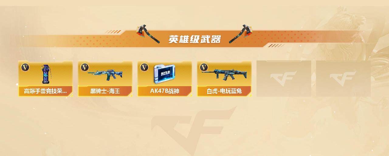 【英雄级武器】:M200-竞技荣光,柯尔特-竞技荣光,擎天-竞技荣光,高爆手雷-竞技荣光*4,烟雾弹-竞技荣光*4,闪光弹-竞技荣光*4,USP-雷暴,M4A1-武圣,Glock18-武圣,QBZ03-金色蔷薇,M14EBR-玄武,HK417-朱雀,白虎-电玩蓝兔,无影-神兵利器,M4A1-雷神,M4A1-黑龙,M4A1-黑骑士,汤姆逊-烈龙*3,AK47-无影,AK47-火麒麟*3,AWM-天龙,Barrett-毁灭,Barrett-极光,AWM-裁决,Barrett-朱雀,AK47-黑鲨,黑骑士-海王,AK47-B-战神,沙鹰-天神,沙鹰-修罗*3,麒麟刺,擎天,龙啸,屠龙