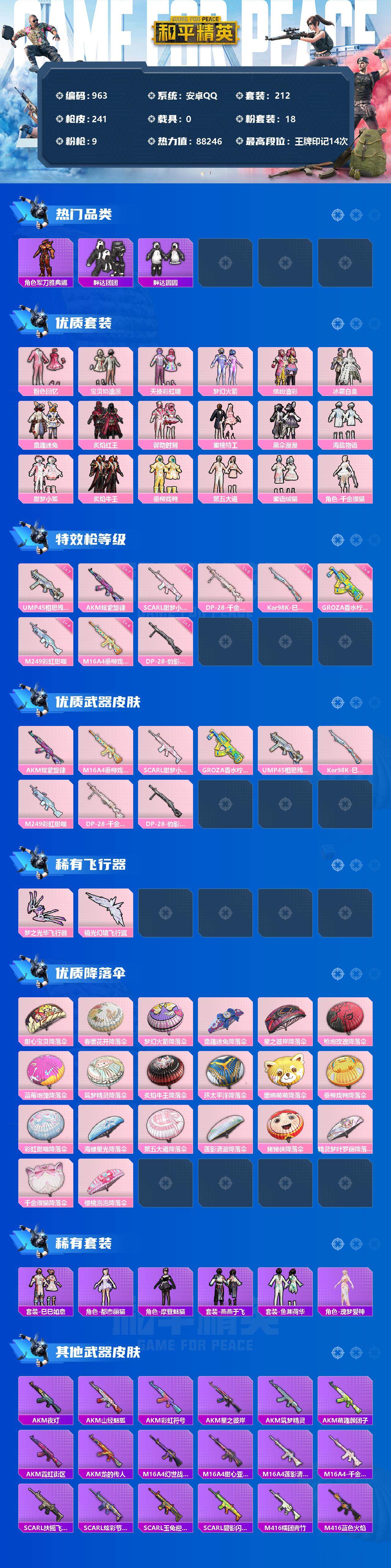 [12587594]安卓 手Q-18粉装-9特效枪-0载具-2粉色飞行器-88246热力值-14王牌印记-212套装-241枪皮 【热门品类】:粉装-梦幻火箭,粉装-童趣迷兔,粉装-缤纷油彩,套装-浪漫天命,套装-深海小丑鱼,角色-军刀雅典娜,套装-胖达团团,套装-胖达圆圆,套装-龟仙人,套装-粉红小猪,套装-红红火火 【粉色套装】:粉装-粉色回忆,粉装-宝贝奶油派,粉装-天使彩虹糖,粉装-梦幻火箭,粉装-缤纷油彩,粉装-冰霜白皇,粉装-童趣迷兔,粉装-炙焰红王,粉装-馨动时刻,粉装-蜜桃特工,粉装-黑伞漫漫,粉装-海盐物语,粉装-甜梦小狐,粉装-炙焰牛王,粉装-垂柳戏鸭,粉装-第五大道,粉装-蜜语绒猫,角色-千金淑猫 【粉色枪皮等级】:AKM-炫紫旋律(七级),M16A4-垂柳戏鸭(四级),SCAR-L-甜梦小狐(七级),GROZA-香水柠檬(四级),UMP45-相思残雪(七级),Kar98K-巳巳如意(五级),M249-彩虹甜喵(四级),DP-28-千金淑猫(五级),DP-28-豹影疾电(一级) 【粉色枪皮】:AKM-炫紫旋律,M16A4-垂柳戏鸭,SCAR-L-甜梦小狐,GROZA-香水柠檬,UMP45-相思残雪,Kar98K-巳巳如意,M249-彩虹甜喵,DP-28-千金淑猫,DP-28-豹影疾电 【粉色飞行器】:梦之光华飞行器,镜光幻境飞行翼 【粉色降落伞】:甜心宝贝降落伞,春暖花开降落伞,梦幻火箭降落伞,童趣迷兔降落伞,星之彼岸降落伞,枪炮玫瑰降落伞,蓝莓炮弹降落伞,筑梦精灵降落伞,炙焰牛王降落伞,环太平洋降落伞,暖熊萌萌降落伞,垂柳戏鸭降落伞,彩虹甜喵降落伞,海螺星光降落伞,第五大道降落伞,莲影清波降落伞,猪猪侠降落伞,精灵梦叶罗丽降落伞,千金淑猫降落伞,樱桃泡泡降落伞 【稀有套装】:套装-龟仙人,套装-巳巳如意,角色-都市丽猫,角色-摩登魅猫,套装-燕燕于飞,套装-鱼渊荷华,角色-瑰梦爱神 【稀有枪皮】:AKM-夜灯,AKM-山经魅狐,AKM-彩虹符号,AKM-星之彼岸,AKM-筑梦精灵,AKM-萌趣颜团子,AKM-霓虹街区,AKM-龙的传人,M16A4-幻世战舞者,M16A4-甜心亚梦,M16A4-莲影清波,M16A4-千金淑猫,SCAR-L-扶摇飞仙,SCAR-L-炫彩节奏,SCAR-L-玉兔迎春,SCAR-L-碧影闪光,M416-糯团青竹,M416-蓝色火焰,G