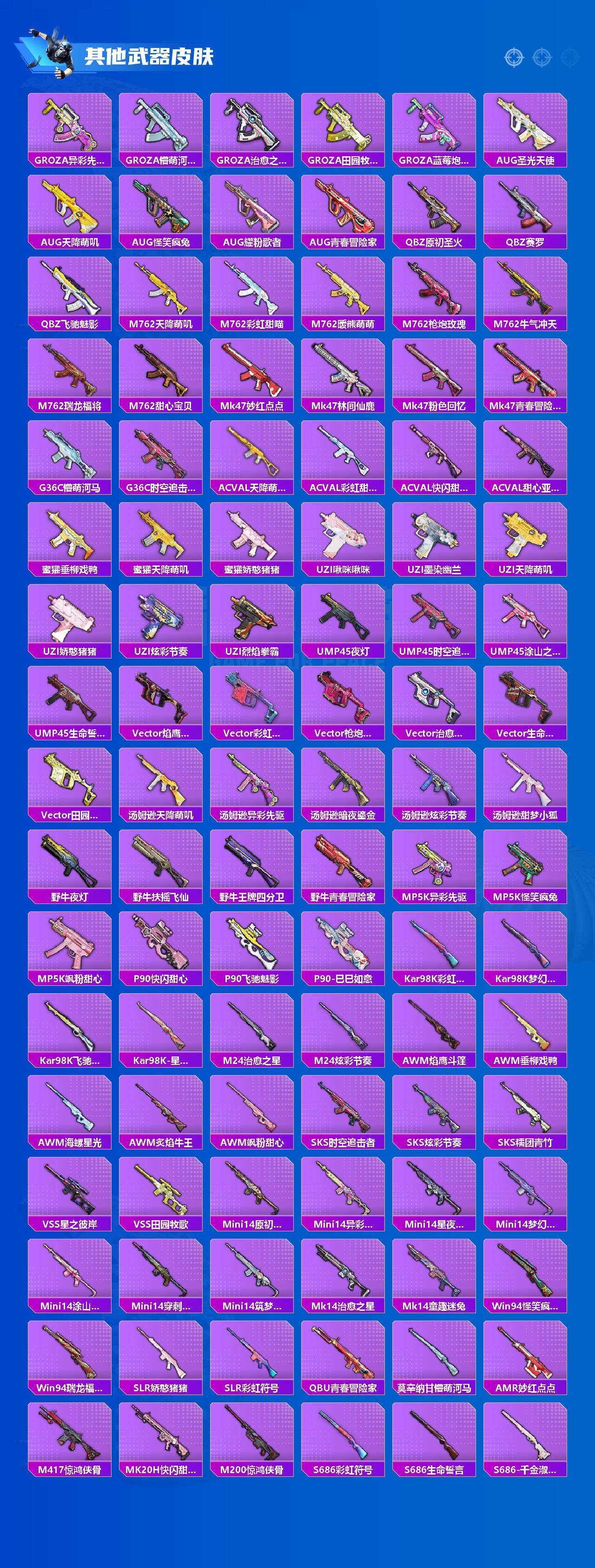 【粉色枪皮】:AKM-炫紫旋律,M16A4-垂柳戏鸭,SCAR-L-甜梦小狐,GROZA-香水柠檬,UMP45-相思残雪,Kar98K-巳巳如意,M249-彩虹甜喵,DP-28-千金淑猫,DP-28-豹影疾电