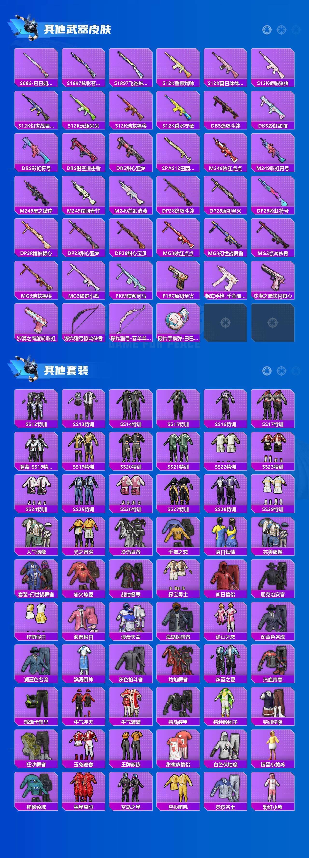 - [11297410]8粉装 5特效枪 1载具 1印记 可二次 可修改实名 身法装备:暗影哥特(红眼罩),萌熊伴侣背包(粉熊背包) 热门装扮:宁雨蝶,荧海星豚,幻彩电音,天龙座 紫龙,梦幻火箭(新101)(新火箭少女101粉色套装),智能音符,绚金战神,繁龙极客,胖达团团 载具:宝马M4(圣保罗黄),僚机-萌兔起飞 稀有枪皮:Kar98K-巳巳如意,MK12-雪月幻音,M416-灵猫魔法师,MG-36-幻彩电音,M416风花雪月 五级特效枪:五级Kar98K-巳巳如意,五级MG-36-幻彩电音,五级M416-风花雪月 三级特效枪:三级M416-灵猫魔法师 一级特效枪:一级MK12-雪月幻音 紫色装扮:时希公主,灵公主,乐音,SS30特训套装,SS31特训套装,云朵鹅,彩虹兔,雪绒豹,SS33特训套装,顶瓜瓜,蓝色运动,超能勇士,空岛之星,缤纷果语,香桃花海,蜜露汐语,魅力单车,黄色运动,柠萌假日,幽冥伯爵,沙漠狂蝎,特殊使命,特训学院,海岛探路者,燕燕于飞,暗影哥特(红眼罩),鱼渊荷华,森林游猎者,星途旅人,SS25特训,天网终结者,星渊小夜曲,大橘大利,星影赞美诗,粉恋花,蓝冰羽,紫幽梦,SS32特训服(SS32特训套装),绯格组合,恋语绒绒,六号稻草人 优质战备:繁龙极客飞行器,幻彩电音降落伞,灵猫魔法师飞行器,灵猫魔法师降落伞,荧海星豚降落伞,冷漠罗丽降落伞,齐天大圣降落伞