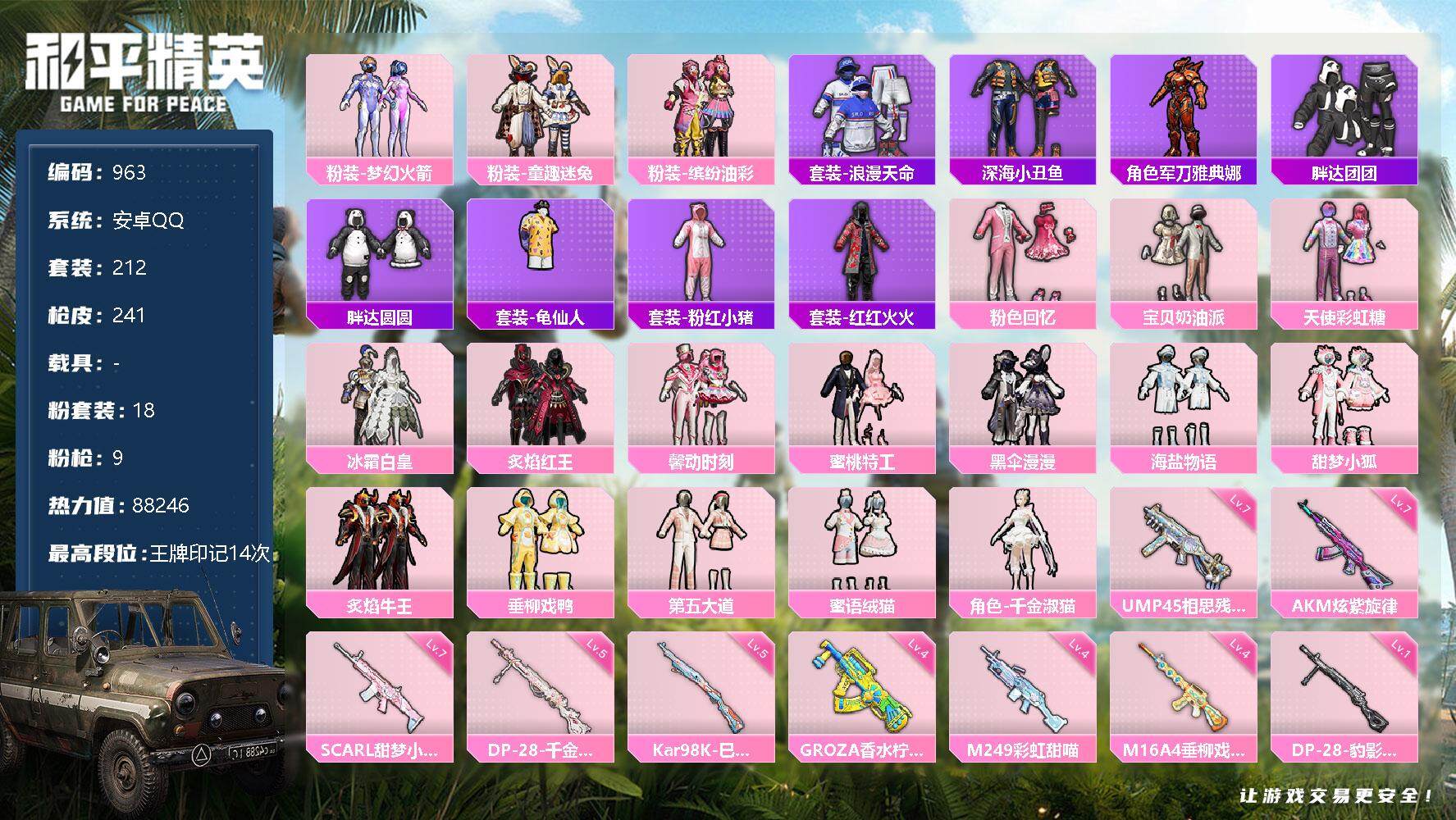 [12587594]安卓 手Q-18粉装-9特效枪-0载具-2粉色飞行器-88246热力值-14王牌印记-212套装-241枪皮