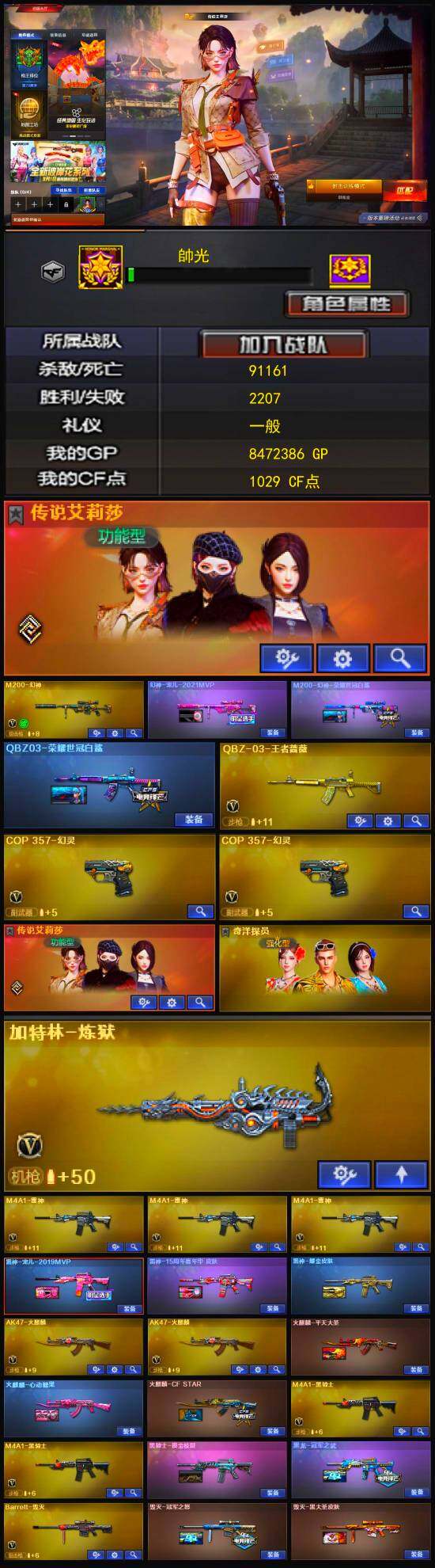 【英雄级武器】:COP 357-幻灵*2,幻灵之锋,无影-神兵利器,M4A1-雷神*3,M4A1-玫瑰精灵,M4A1-黑骑士*2,加特林-炼狱,AK47-火麒麟*2,AWM-天龙,Barrett-毁灭,M200-幻神,黑武士-锦绣游龙,AK-47-猩红传说,沙鹰-修罗*5,麒麟刺,擎天,龙啸,屠龙
