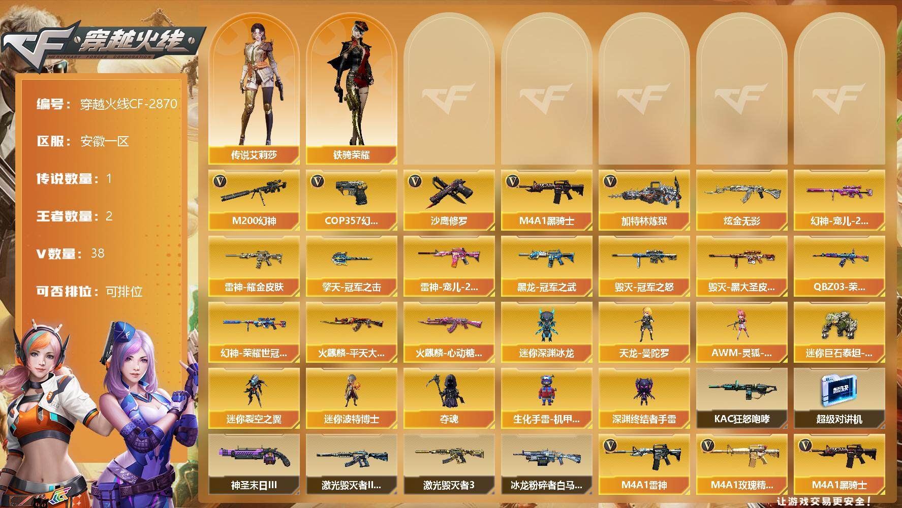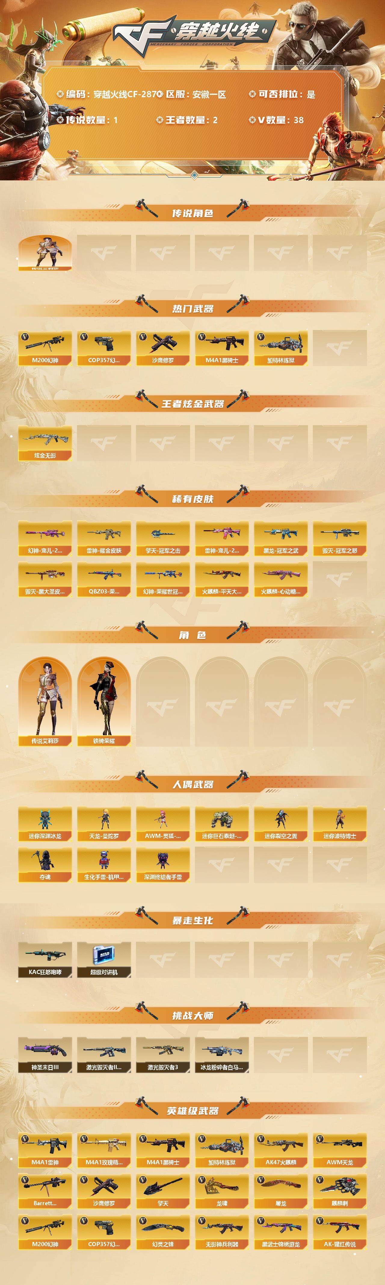 [12587605]安徽一区-38V-2王者-1炫金 【传说角色】:传说艾莉莎 【热门武器】:M200-幻神,M4A1-黑骑士*2,加特林-炼狱,COP 357-幻灵*2,沙鹰-修罗*5 【王者炫金武器】:炫金无影 【稀有皮肤】:幻神-宠儿-2021MVP,M200-幻神-荣耀世冠白鲨,QBZ03-荣耀世冠白鲨,雷神-耀金皮肤,雷神-宠儿-2019MVP,火麒麟-平天大圣,火麒麟-心动糖果,黑龙-冠军之武,毁灭-冠军之怒,毁灭-黑大圣皮肤,擎天-冠军之击 【角色】:传说艾莉莎,铁骑荣耀 【人偶武器】:天龙-曼陀罗,AWM-灵狐-15周年嘉年华,迷你深渊冰龙,迷你巨石泰坦-魔花研究所,迷你裂空之翼,迷你波特博士*2,夺魂*2,生化手雷-机甲核心,深渊终结者手雷*2 【暴走生化】:KAC-狂怒咆哮,超级对讲机 【挑战大师】:神圣爆裂者-末日III,激光毁灭者III,激光毁灭者III-白马银枪*2,冰龙粉碎者-白马银枪 【英雄级武器】:COP 357-幻灵*2,幻灵之锋,无影-神兵利器,M4A1-雷神*3,M4A1-玫瑰精灵,M4A1-黑骑士*2,加特林-炼狱,AK47-火麒麟*2,AWM-天龙,Barrett-毁灭,M200-幻神,黑武士-锦绣游龙,AK-47-猩红传说,沙鹰-修罗*5,麒麟刺,擎天,龙啸,屠龙 【特殊枪械】:2黑骑士,1炼狱