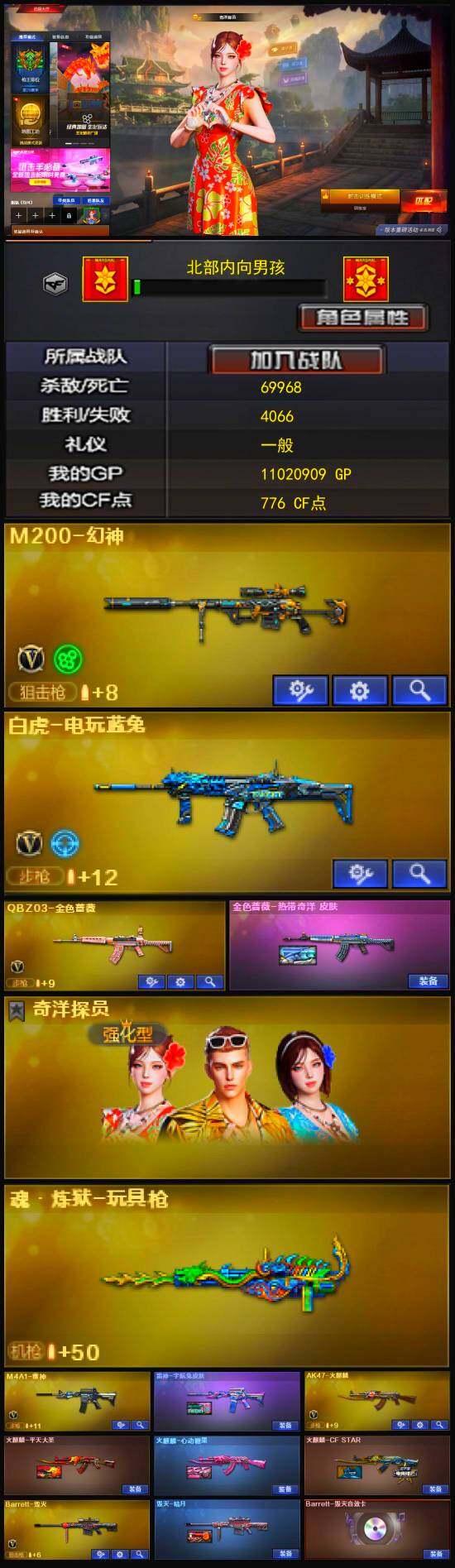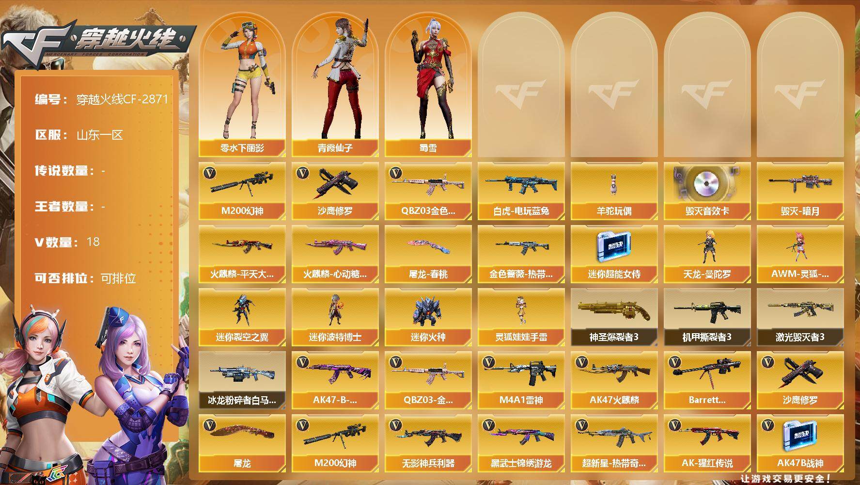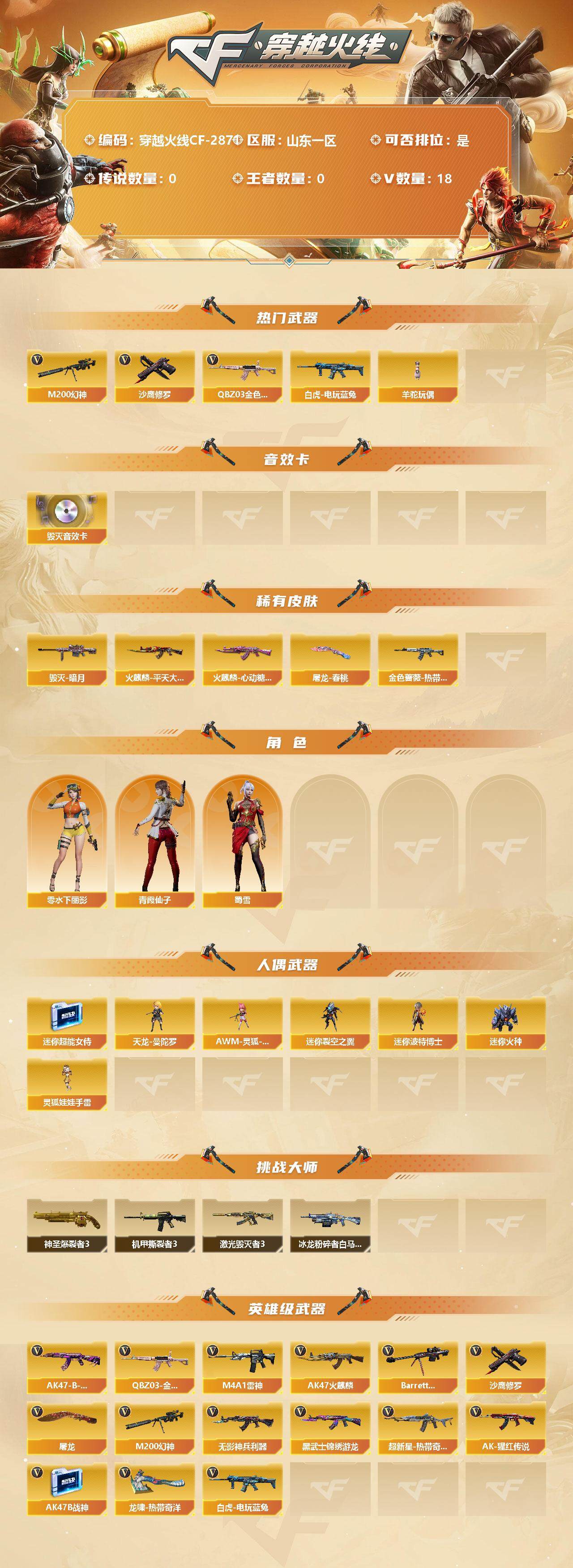 [12587788]山东一区-18V-0王者-0炫金 【热门武器】:QBZ03-金色蔷薇,M200-幻神,白虎-电玩蓝兔,羊驼玩偶,沙鹰-修罗 【音效卡】:Barrett-毁灭音效卡 【稀有皮肤】:金色蔷薇-热带奇洋 皮肤,火麒麟-平天大圣,火麒麟-心动糖果,毁灭-暗月,屠龙-春桃 皮肤 【角色】:零-水下丽影,蜀雪,青霞仙子 【人偶武器】:天龙-曼陀罗,AWM-灵狐-15周年嘉年华,迷你超能女侍,迷你裂空之翼*2,迷你波特博士,迷你火种,灵狐娃娃手雷*2 【挑战大师】:神圣爆裂者III,机甲撕裂者III,激光毁灭者III,冰龙粉碎者-白马银枪 【英雄级武器】:QBZ03-金色蔷薇,白虎-电玩蓝兔,无影-神兵利器,M4A1-雷神,AK47-火麒麟,Barrett-毁灭,M200-幻神,黑武士-锦绣游龙,超新星-热带奇洋,AK-47-猩红传说,AK47-B-战神,AK47-B-常胜将军,沙鹰-修罗,屠龙,龙啸-热带奇洋 【特殊枪械】: