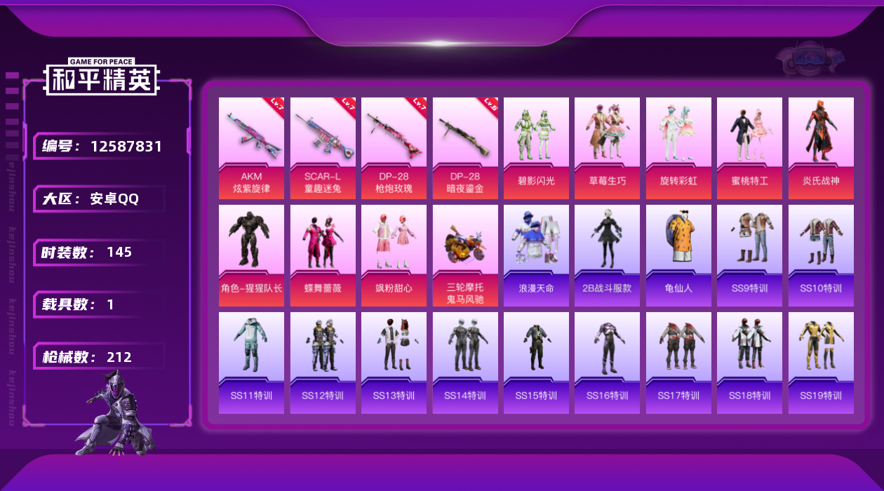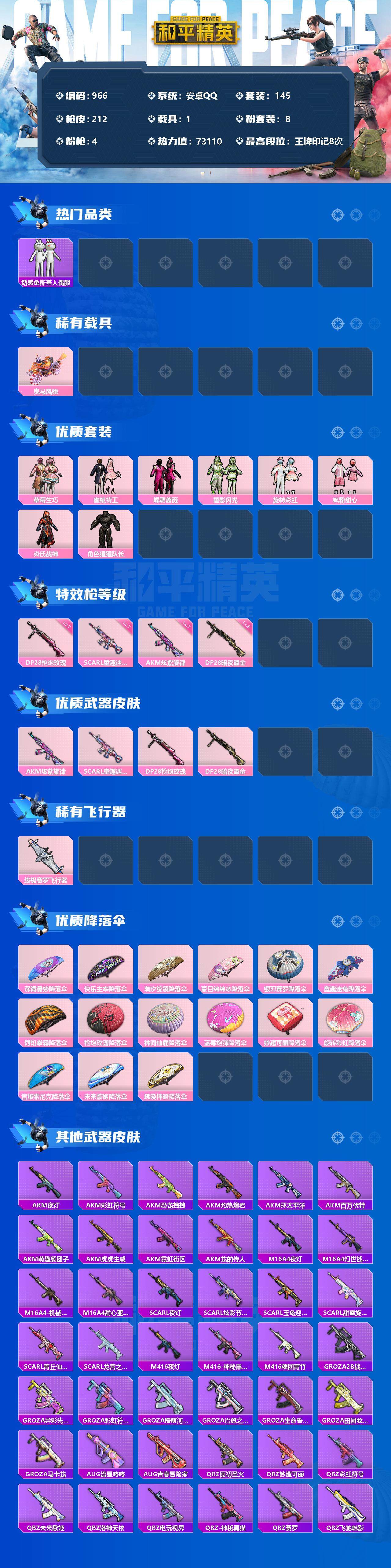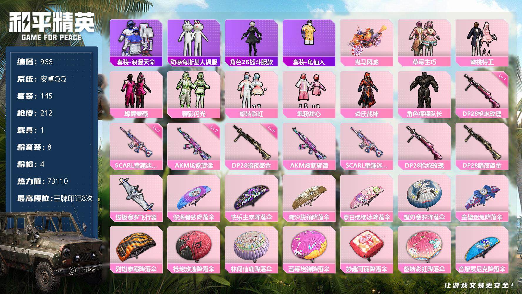 [12587831]安卓 手Q-8粉装-4特效枪-1载具-1粉色飞行器-73110热力值-8王牌印记-145套装-212枪皮 【热门品类】:套装-浪漫天命,套装-动感兔斯基人偶服,角色-2B战斗服款,套装-龟仙人 【粉色载具】:鬼马风驰 【粉色套装】:粉装-草莓生巧,粉装-蜜桃特工,粉装-蝶舞蔷薇,粉装-碧影闪光,粉装-旋转彩虹,粉装-飒粉甜心,粉装-炎氏战神,角色-猩猩队长 【粉色枪皮等级】:AKM-炫紫旋律(七级),SCAR-L-童趣迷兔(七级),DP-28-枪炮玫瑰(七级),DP-28-暗夜鎏金(六级) 【粉色枪皮】:AKM-炫紫旋律,SCAR-L-童趣迷兔,DP-28-枪炮玫瑰,DP-28-暗夜鎏金 【粉色飞行器】:终极赛罗飞行器 【粉色降落伞】:深海曼妙降落伞,快乐主宰降落伞,潮汐统领降落伞,夏日绵绵冰降落伞,银刃赛罗降落伞,童趣迷兔降落伞,烈焰拳霸降落伞,枪炮玫瑰降落伞,林间仙鹿降落伞,蓝莓炮弹降落伞,妙趣可丽降落伞,旋转彩虹降落伞,音爆索尼克降落伞,未来歌姬降落伞,拂晓神骑降落伞 【稀有套装】:套装-龟仙人 【稀有枪皮】:AKM-夜灯,AKM-彩虹符号,AKM-恐龙拽拽,AKM-灼热熔岩,AKM-环太平洋,AKM-百万伏特,AKM-萌趣颜团子,AKM-虎虎生威,AKM-霓虹街区,AKM-龙的传人,M16A4-夜灯,M16A4-幻世战舞者,M16A4-机械英豪,M16A4-甜心亚梦,SCAR-L-夜灯,SCAR-L-炫彩节奏,SCAR-L-玉兔迎春,SCAR-L-甜蜜旋律,SCAR-L-青丘仙客,SCAR-L-龙宫之主,M416-夜灯,M416-神秘黑猫,M416-糯团青竹,GROZA-2B战斗服款,GROZA-异彩先驱,GROZA-彩虹符号,GROZA-懵萌河马,GROZA-治愈之星,GROZA-生命誓言,GROZA-田园牧歌,GROZA-马卡龙,AUG-流星咚咚,AUG-青春冒险家,QBZ-原初圣火,QBZ-妙趣可丽,QBZ-彩虹符号,QBZ-未来歌姬,QBZ-洛神天依,QBZ-电玩视界,QBZ-神秘黑猫,QBZ-赛罗,QBZ-飞驰魅影,M762-天降萌叽,M762-暗夜鎏金,M762-烈焰拳霸,M762-牛气冲天,M762-瑞龙福将,M762-镭射皇者,Mk47-妙红点点,Mk47-百万伏特,Mk47-青春冒险家,G36C-不夜海上花,G36C-懵萌河马,G36C-