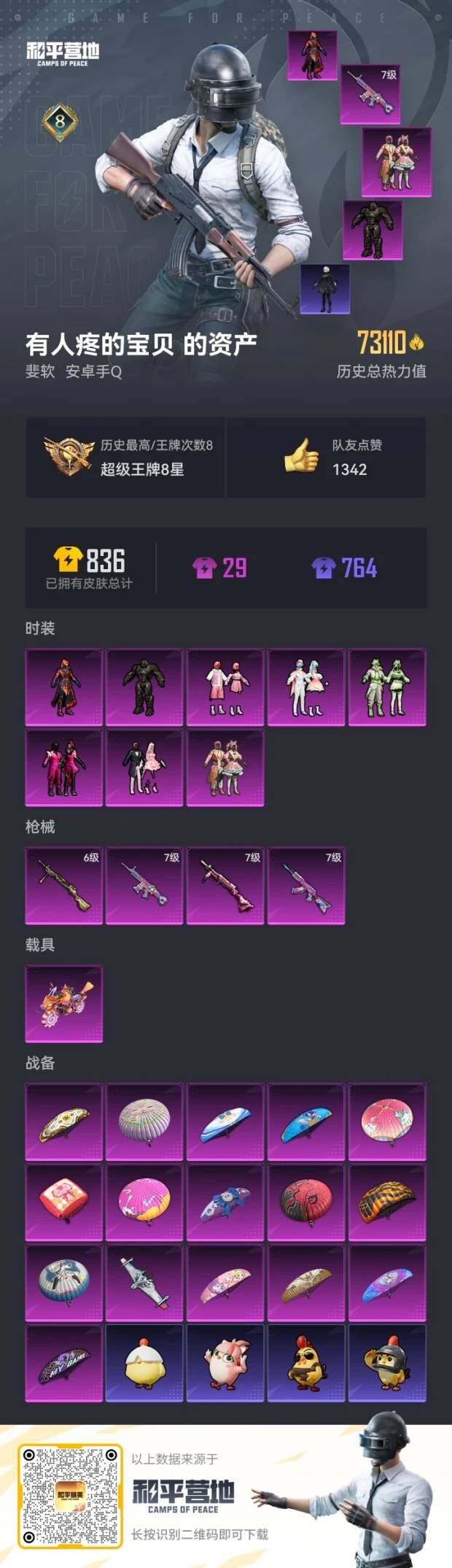 [12587831]安卓 手Q-8粉装-4特效枪-1载具-1粉色飞行器-73110热力值-8王牌印记-145套装-212枪皮