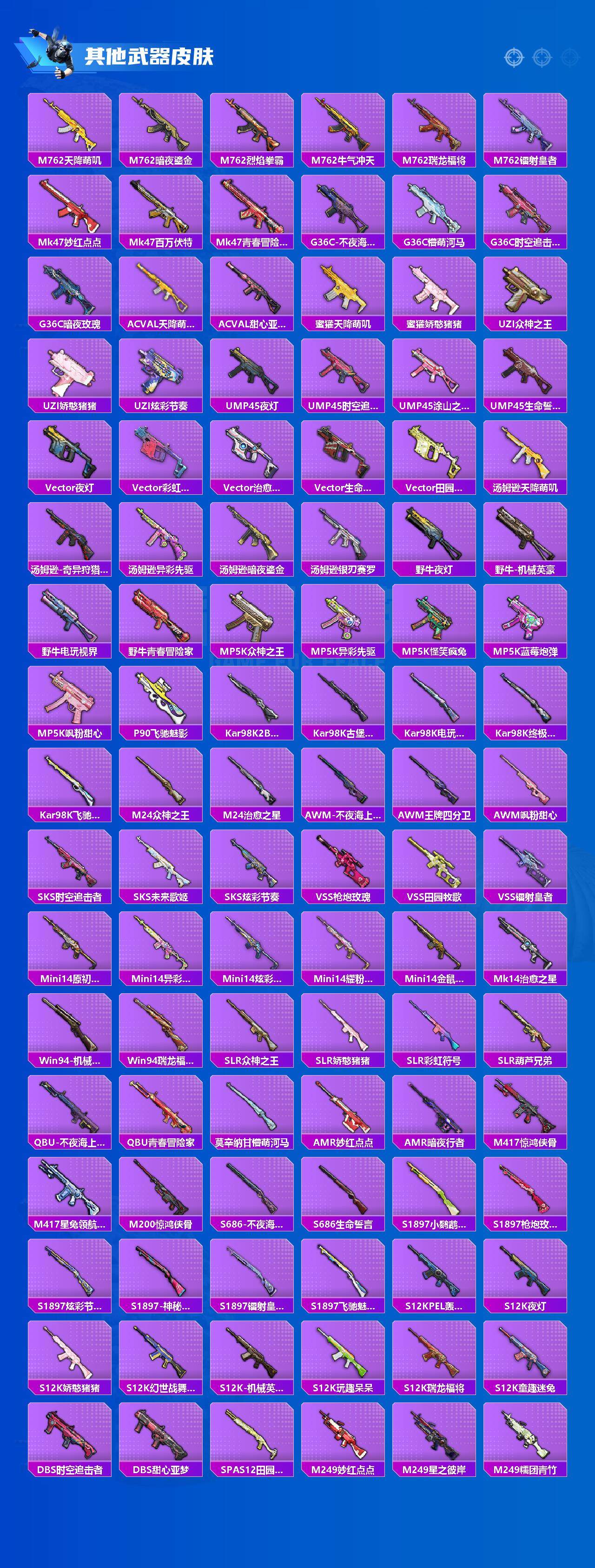 【稀有枪皮】:AKM-夜灯,AKM-彩虹符号,AKM-恐龙拽拽,AKM-灼热熔岩,AKM-环太平洋,AKM-百万伏特,AKM-萌趣颜团子,AKM-虎虎生威,AKM-霓虹街区,AKM-龙的传人,M16A4-夜灯,M16A4-幻世战舞者,M16A4-机械英豪,M16A4-甜心亚梦,SCAR-L-夜灯,SCAR-L-炫彩节奏,SCAR-L-玉兔迎春,SCAR-L-甜蜜旋律,SCAR-L-青丘仙客,SCAR-L-龙宫之主,M416-夜灯,M416-神秘黑猫,M416-糯团青竹,GROZA-2B战斗服款,GROZA-异彩先驱,GROZA-彩虹符号,GROZA-懵萌河马,GROZA-治愈之星,GROZA-生命誓言,GROZA-田园牧歌,GROZA-马卡龙,AUG-流星咚咚,AUG-青春冒险家,QBZ-原初圣火,QBZ-妙趣可丽,QBZ-彩虹符号,QBZ-未来歌姬,QBZ-洛神天依,QBZ-电玩视界,QBZ-神秘黑猫,QBZ-赛罗,QBZ-飞驰魅影,M762-天降萌叽,M762-暗夜鎏金,M762-烈焰拳霸,M762-牛气冲天,M762-瑞龙福将,M762-镭射皇者,Mk47-妙红点点,Mk47-百万伏特,Mk47-青春冒险家,G36C-不夜海上花,G36C-懵萌河马,G36C-