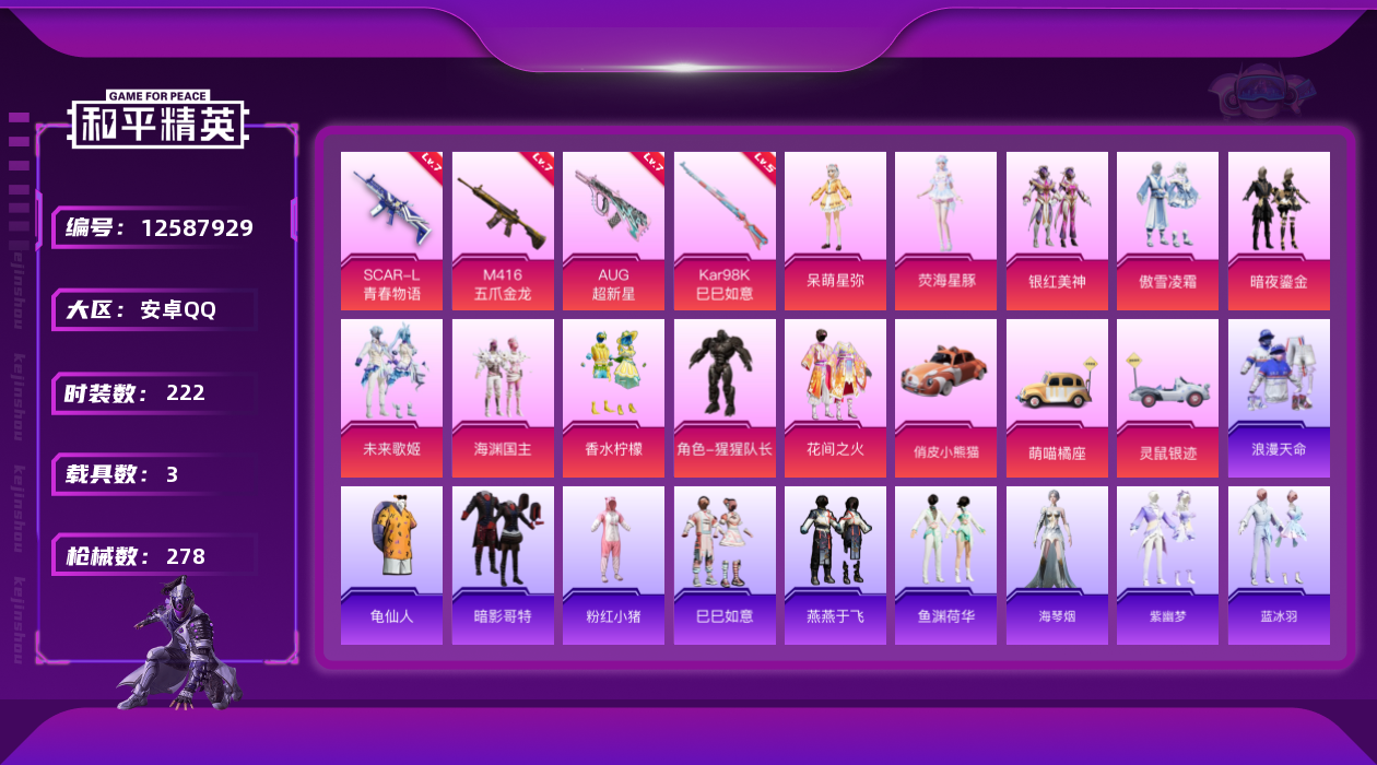 [12587929]安卓 手Q-10粉装-4特效枪-3载具-0粉色飞行器-95749热力值-10王牌印记-222套装-278枪皮 【热门品类】:套装-浪漫天命,套装-动感兔斯基人偶服,套装-龟仙人,套装-暗影哥特,套装-浪漫波比,套装-粉红小猪 【粉色载具】:灵鼠银迹,萌喵橘座,俏皮小熊猫 【粉色套装】:粉装-花间之火,粉装-香水柠檬,粉装-海渊国主,粉装-傲雪凌霜,粉装-银红美神,粉装-暗夜鎏金,角色-呆萌星弥,粉装-未来歌姬,角色-猩猩队长,角色-荧海星豚 【粉色枪皮等级】:SCAR-L-青春物语(七级),M416-五爪金龙(七级),AUG-超新星(七级),Kar98K-巳巳如意(五级) 【粉色枪皮】:SCAR-L-青春物语,M416-五爪金龙,AUG-超新星,Kar98K-巳巳如意 【粉色降落伞】:极限特训降落伞,至尊龙雀降落伞,天启纪元降落伞,炫紫旋律降落伞,神秘黑猫降落伞,古堡领主降落伞,伏魔团降落伞,阿狸红降落伞,香水柠檬降落伞,暗夜玫瑰降落伞,洛神天依降落伞,蓝莓炮弹降落伞,甜心娃娃降落伞,碧影闪光降落伞,太空嘟嘟降落伞,彩虹甜喵降落伞,旋转彩虹降落伞,飒粉甜心降落伞,闲梦青缨降落伞,萌物绒绒降落伞,鬼刀降落伞,智耀战神降落伞 【稀有套装】:套装-龟仙人,套装-巳巳如意,套装-燕燕于飞,套装-鱼渊荷华,角色-海琴烟,套装-紫幽梦,套装-蓝冰羽,套装-星影赞美诗 【稀有枪皮】:AKM-夜灯,AKM-天启纪元,AKM-奇异狩猎者,AKM-彩虹符号,AKM-灼热熔岩,AKM-玉龙,AKM-生命誓言,AKM-萌趣颜团子,AKM-虎虎生威,AKM-霓虹街区,M16A4-九霄,M16A4-幻世战舞者,M16A4-机械英豪,M16A4-甜心亚梦,M16A4-蓝色火焰,M16A4-魔法学院,SCAR-L-暗夜玫瑰,SCAR-L-炫彩节奏,SCAR-L-玉兔迎春,SCAR-L-甜蜜誓约,M416-夜灯,M416-神秘黑猫,M416-糯团青竹,M416-红色方程式,M416-绯红前夜,GROZA-异彩先驱,GROZA-懵萌河马,GROZA-暗夜武装,GROZA-治愈之星,GROZA-田园牧歌,GROZA-蓝莓炮弹,GROZA-黑色刀锋,AUG-凝视深渊,AUG-天降萌叽,AUG-青春冒险家,QBZ-原初圣火,QBZ-彩虹符号,QBZ-洛神天依,QBZ-飞驰魅影,M762-天降萌叽,M762