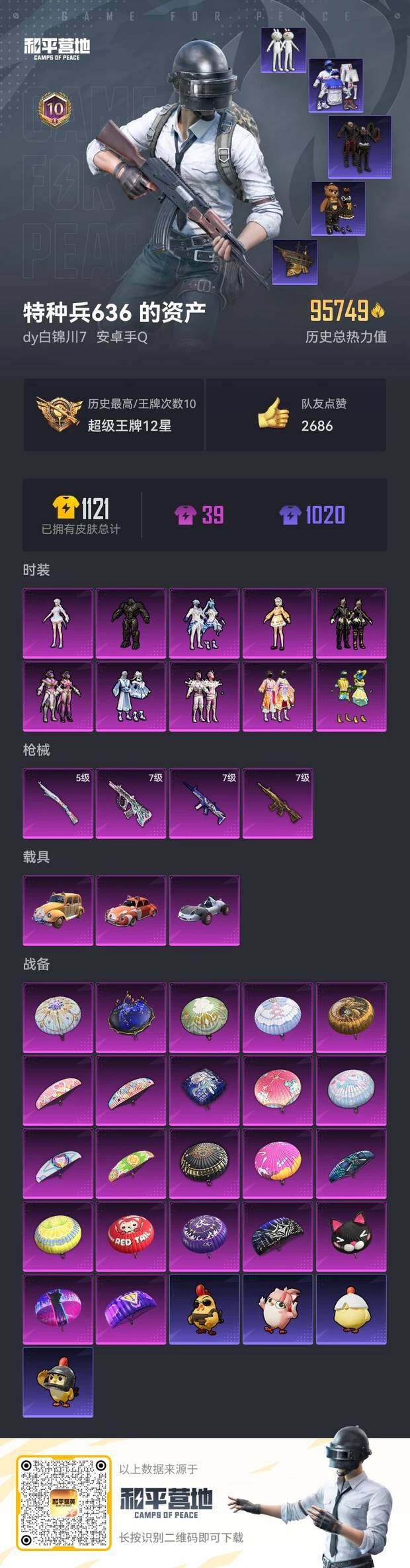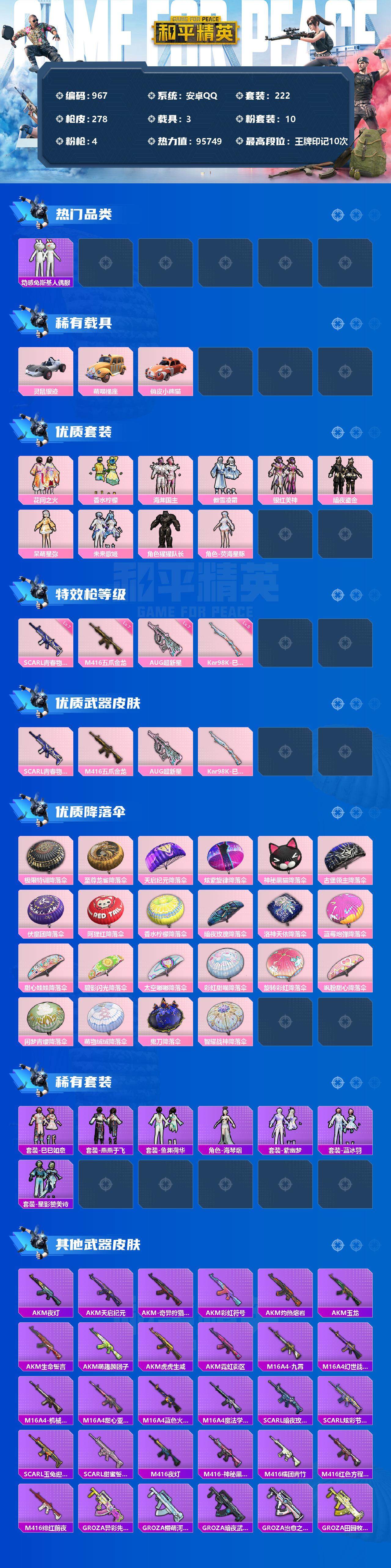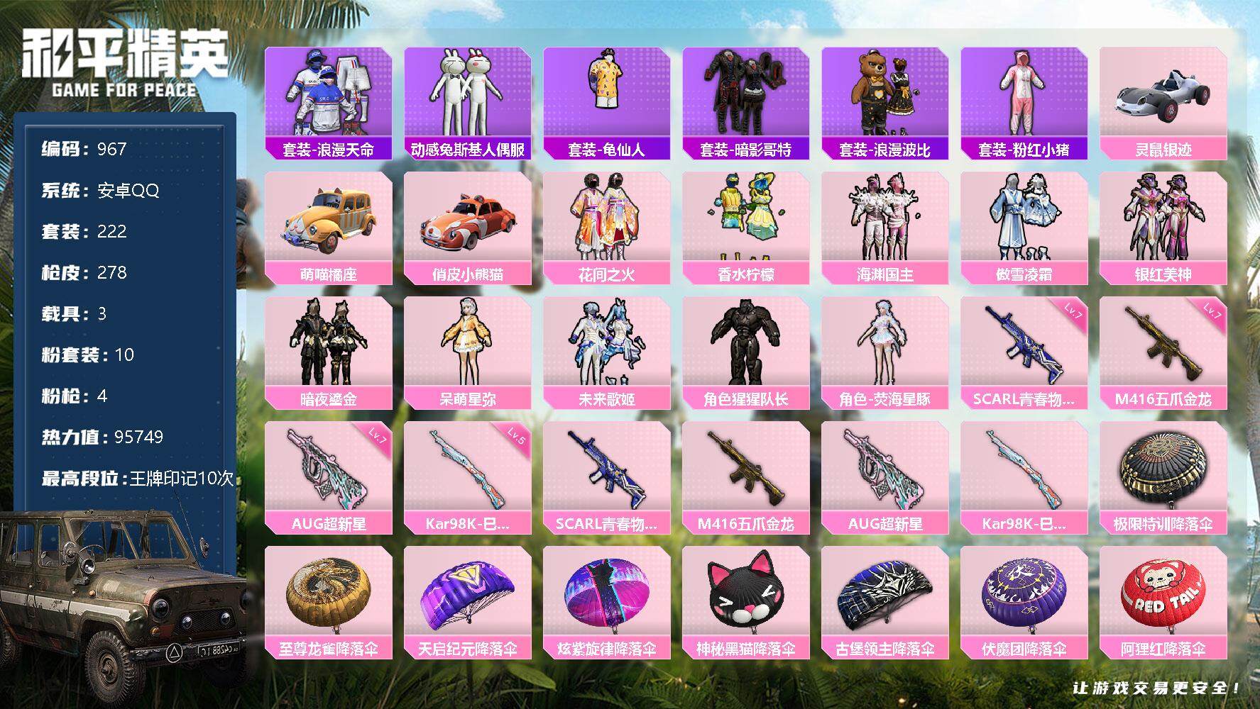 [12587929]安卓 手Q-10粉装-4特效枪-3载具-0粉色飞行器-95749热力值-10王牌印记-222套装-278枪皮