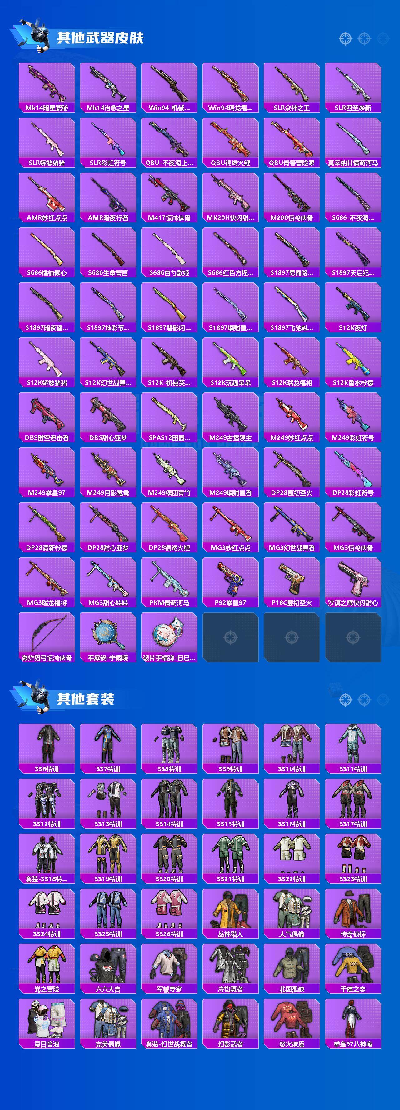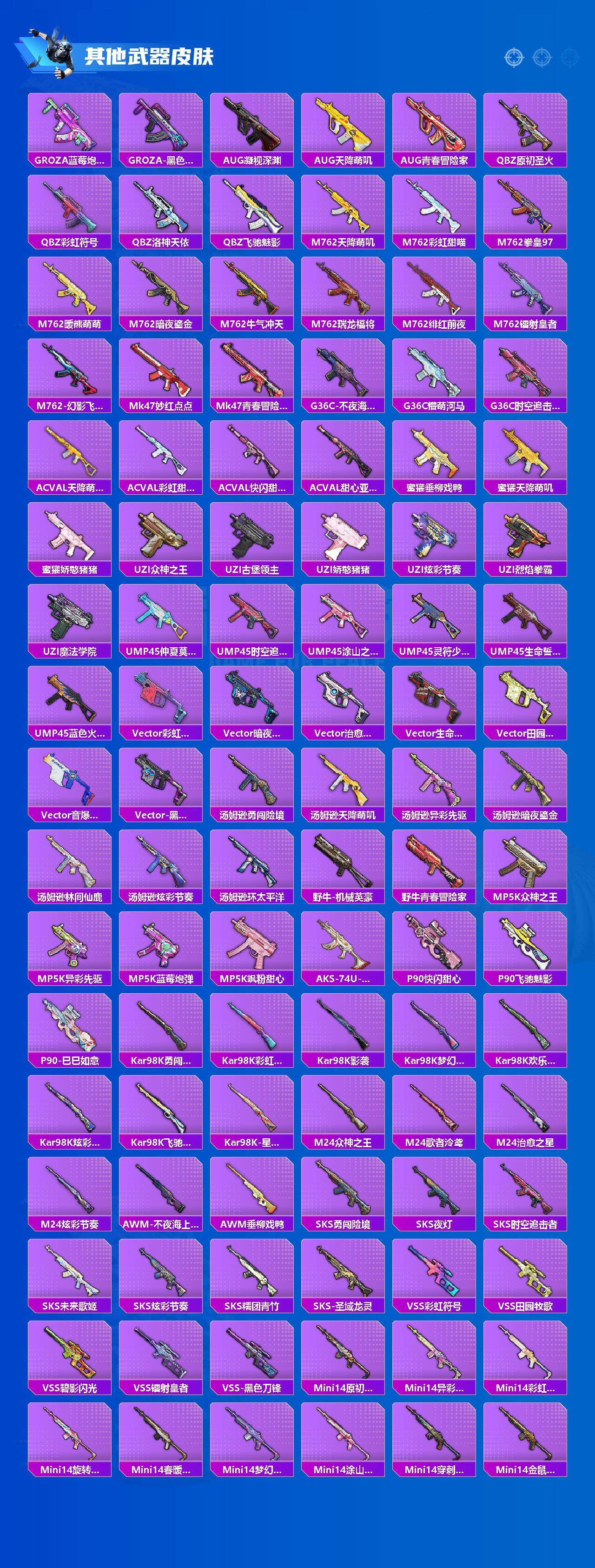 【稀有枪皮】:AKM-夜灯,AKM-天启纪元,AKM-奇异狩猎者,AKM-彩虹符号,AKM-灼热熔岩,AKM-玉龙,AKM-生命誓言,AKM-萌趣颜团子,AKM-虎虎生威,AKM-霓虹街区,M16A4-九霄,M16A4-幻世战舞者,M16A4-机械英豪,M16A4-甜心亚梦,M16A4-蓝色火焰,M16A4-魔法学院,SCAR-L-暗夜玫瑰,SCAR-L-炫彩节奏,SCAR-L-玉兔迎春,SCAR-L-甜蜜誓约,M416-夜灯,M416-神秘黑猫,M416-糯团青竹,M416-红色方程式,M416-绯红前夜,GROZA-异彩先驱,GROZA-懵萌河马,GROZA-暗夜武装,GROZA-治愈之星,GROZA-田园牧歌,GROZA-蓝莓炮弹,GROZA-黑色刀锋,AUG-凝视深渊,AUG-天降萌叽,AUG-青春冒险家,QBZ-原初圣火,QBZ-彩虹符号,QBZ-洛神天依,QBZ-飞驰魅影,M762-天降萌叽,M762