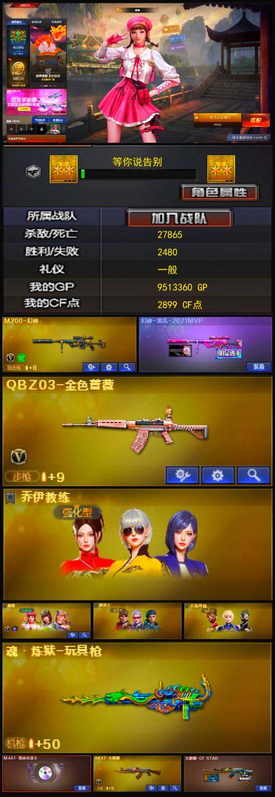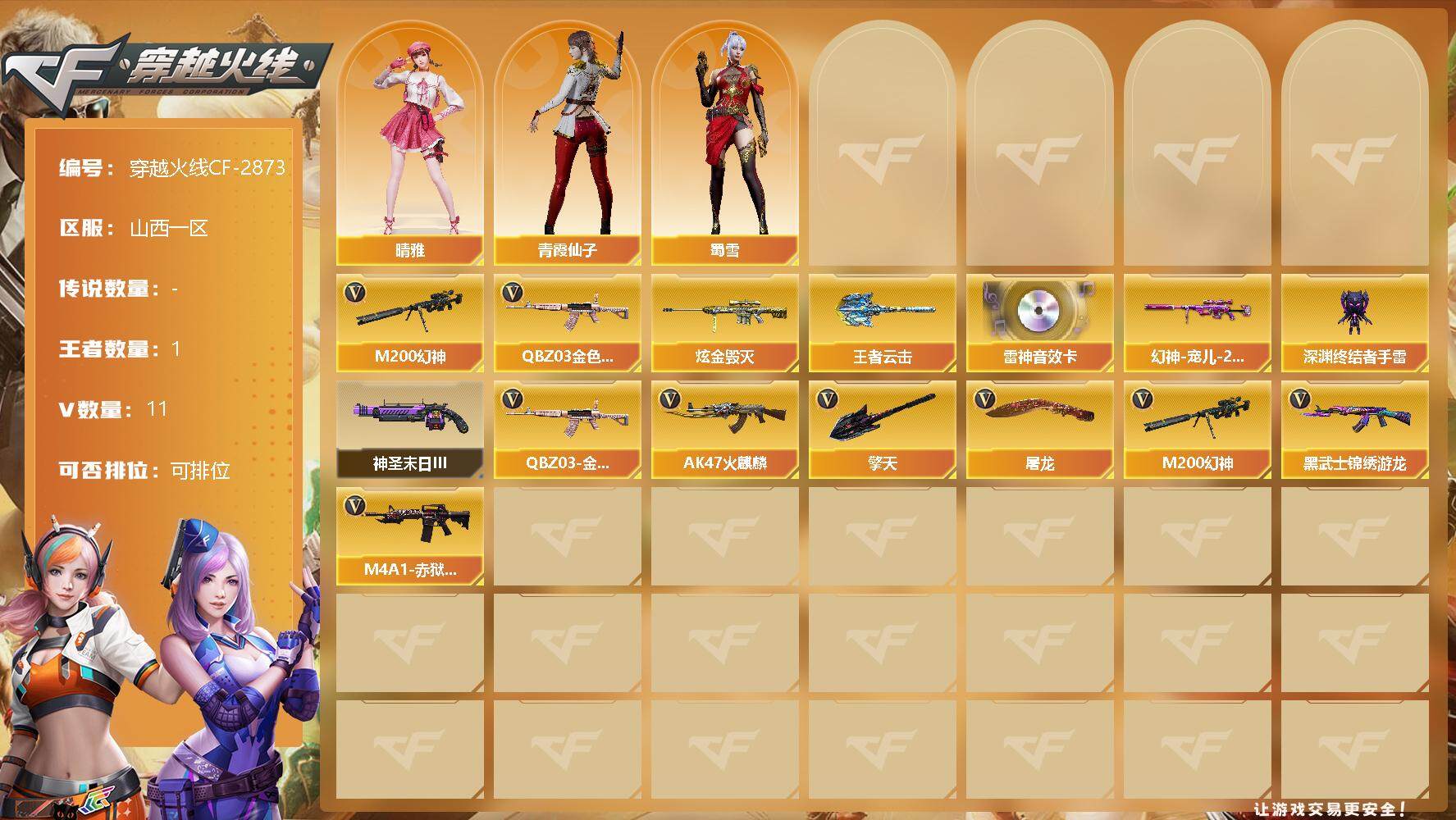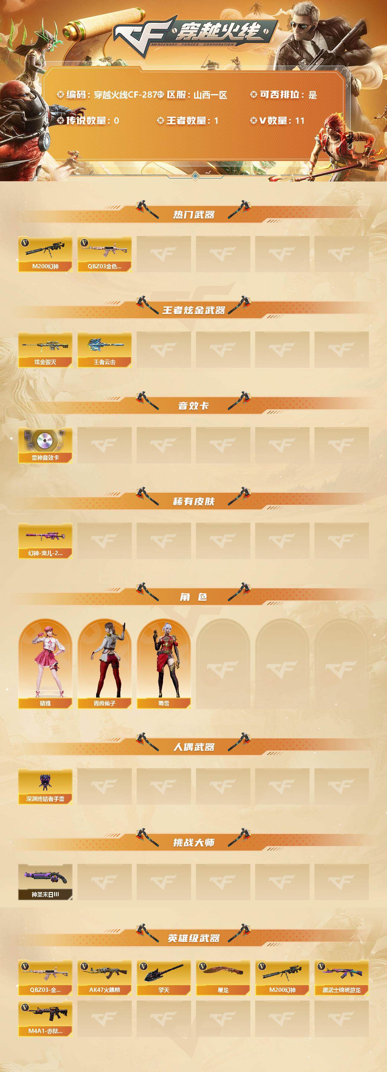 [12588060]山西一区-11V-1王者-1炫金 【热门武器】:QBZ03-金色蔷薇,M200-幻神 【王者炫金武器】:炫金毁灭,王者云击 【音效卡】:M4A1-雷神音效卡 【稀有皮肤】:幻神-宠儿-2021MVP 【角色】:晴雅,蜀雪,青霞仙子 【人偶武器】:深渊终结者手雷 【挑战大师】:神圣爆裂者-末日III 【英雄级武器】:QBZ03-金色蔷薇,AK47-火麒麟,M200-幻神,黑武士-锦绣游龙,M4A1-赤狱骑士,擎天,屠龙 【特殊枪械】: