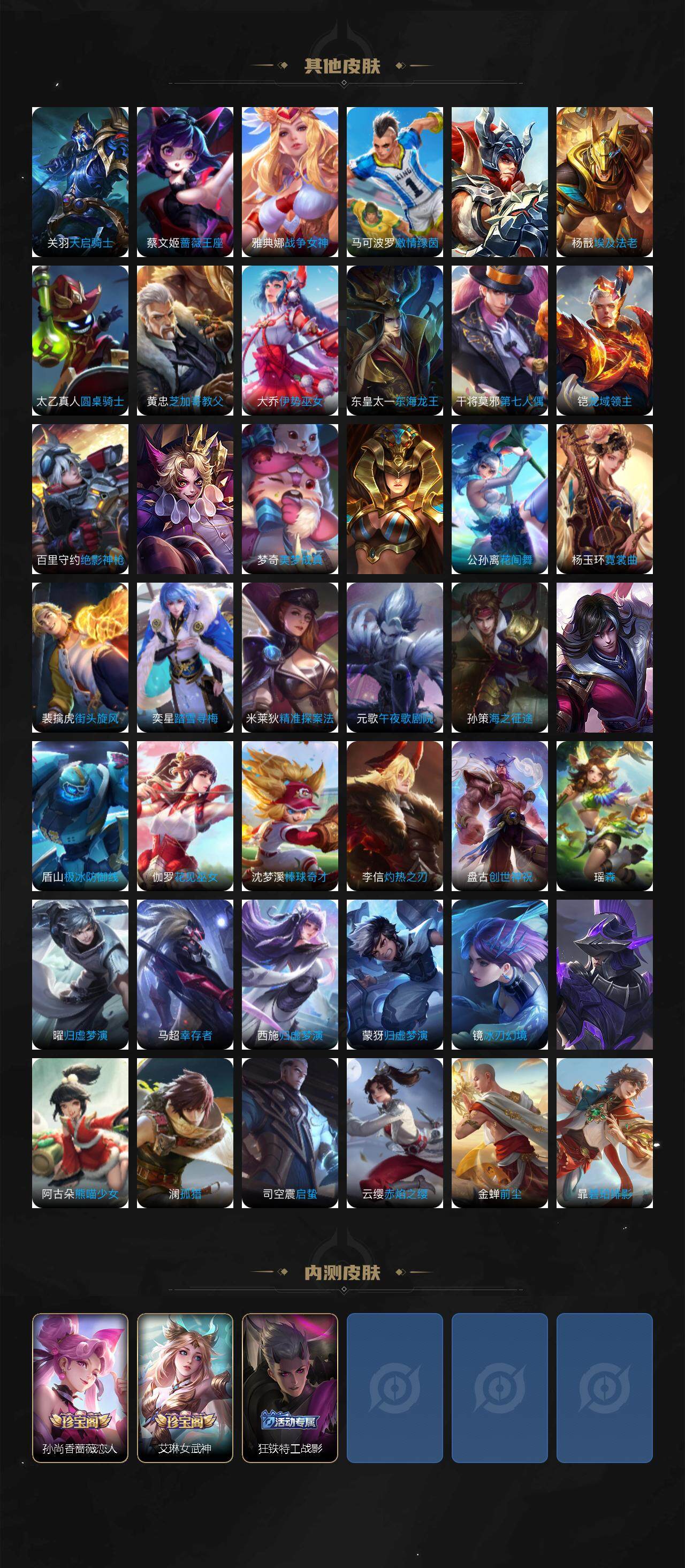 米莱狄御霄,牛魔御旌,盾山御銮,夏侯惇朔风刀,明世隐疑决卦,老夫子醍醐杖,鬼谷子原初探秘者,狄仁杰万华元夜,程咬金演武夺筹,钟馗驱傩正仪,苏烈千军破阵,马可波罗暗影游猎,元歌云间偶戏,弈星混沌棋,达摩沙漠行僧,兰陵王金庭之子,沈梦溪大漠名商,李元芳云中旅人,桑启海盐诗旅,裴擒虎擒涛扼浪,鲁班大师探海日志,张良古海寻踪