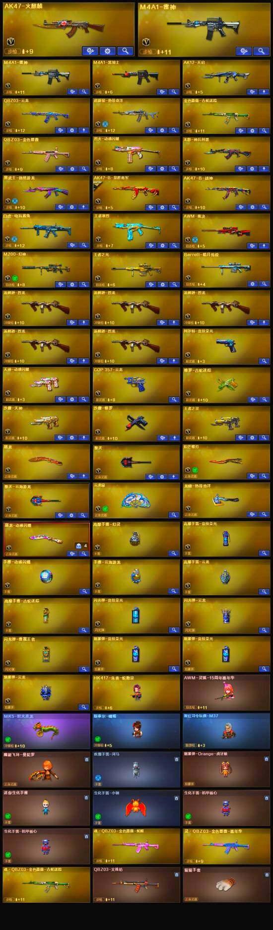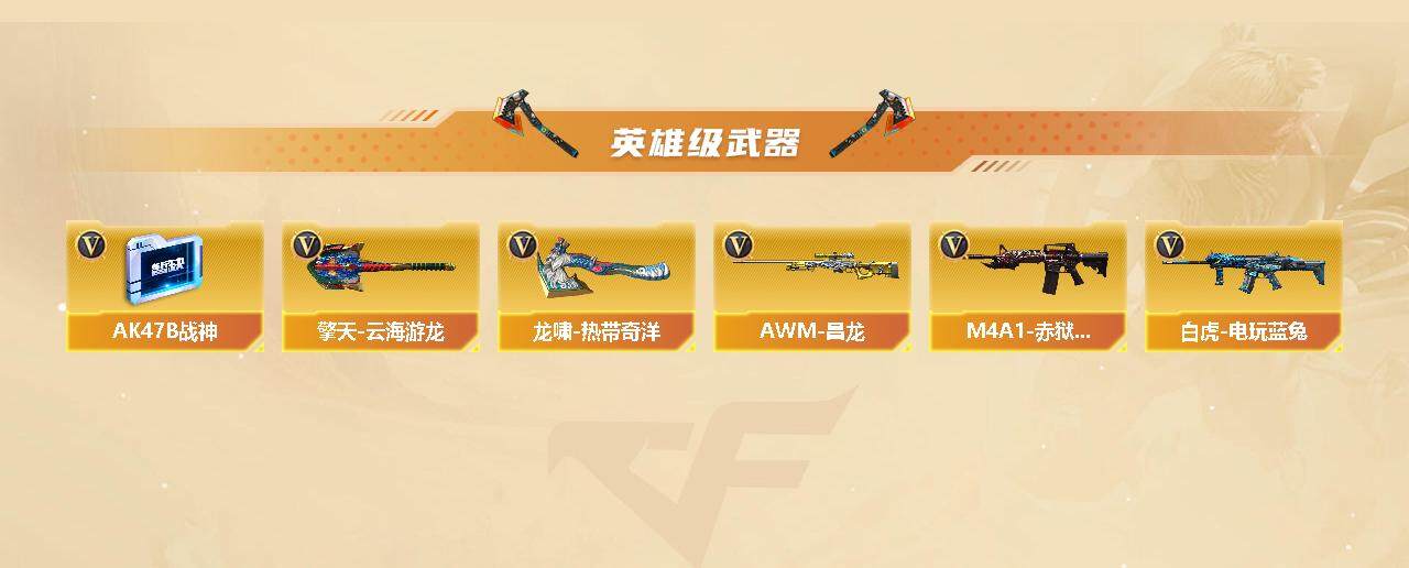 【英雄级武器】:QBZ03-云龙,COP 357-云龙,柯尔特-竞技荣光,高爆手雷-竞技荣光,烟雾弹-竞技荣光*2,闪光弹-竞技荣光,烈火-动感闪耀,天神-动感闪耀,屠龙-动感闪耀,手雷-动感闪耀,QBZ03-金色蔷薇,金色蔷薇-古蛇迷踪,白虎-电玩蓝兔,无影-神兵利器,M4A1-雷神*2,M4A1-黑骑士,汤姆逊-烈龙*5,AK47-火麒麟,AK12-天启,AWM-裁决,M200-幻神,黑武士-锦绣游龙,超新星-热带奇洋,AK-47-猩红传说,AK47-B-战神,AK47-B-常胜将军,AWM-昌龙,M4A1-赤狱骑士,修罗-古蛇迷踪,沙鹰-天神,沙鹰-修罗,炽芒蝶刃,擎天,屠龙,擎天-云海游龙,龙啸-热带奇洋