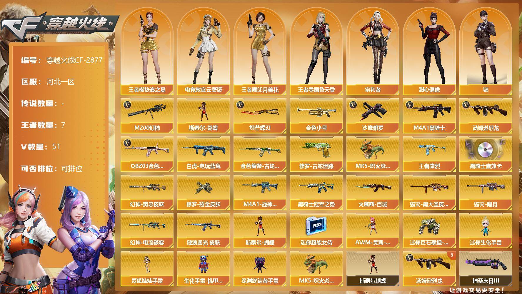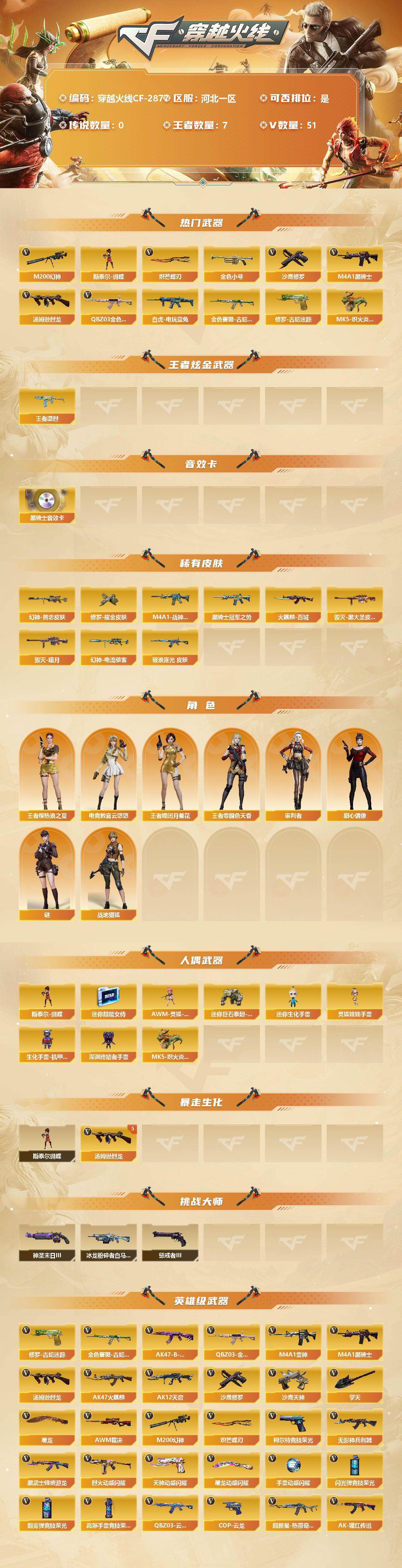 [12588869]河北一区-51V-7王者-0炫金 【热门武器】:QBZ03-金色蔷薇,M200-幻神,金色蔷薇-古蛇迷踪,修罗-古蛇迷踪,白虎-电玩蓝兔,金色小号,M4A1-黑骑士,汤姆逊-烈龙*5,斯泰尔-蝴蝶,MK5-炽火炎龙,沙鹰-修罗,炽芒蝶刃 【王者炫金武器】:王者凛烈 【音效卡】:M4A1-黑骑士音效卡 【稀有皮肤】:M200-幻神-黄忠皮肤,幻神-电流骇客 皮肤,金色蔷薇-破浪逐光 皮肤,M4A1-战神赵云,火麒麟-百城,黑骑士-冠军之势,毁灭-暗月,毁灭-黑大圣皮肤,修罗耀金皮肤 【角色】:王者-瞳-闭月羞花,王者樱-热浪之夏,王者-零-国色天香,审判者,电竞教官-云悠悠,谜,战地猎狐,甜心偶像 【人偶武器】:MK5-炽火炎龙,斯泰尔-蝴蝶,AWM-灵狐-15周年嘉年华,迷你超能女侍,迷你巨石泰坦-魔花研究所,迷你生化手雷,灵狐娃娃手雷,生化手雷-机甲核心*2,深渊终结者手雷 【暴走生化】:斯泰尔-蝴蝶 【挑战大师】:神圣爆裂者-末日III,惩戒者III,冰龙粉碎者-白马银枪*2 【英雄级武器】:QBZ03-云龙,COP 357-云龙,柯尔特-竞技荣光,高爆手雷-竞技荣光,烟雾弹-竞技荣光*2,闪光弹-竞技荣光,烈火-动感闪耀,天神-动感闪耀,屠龙-动感闪耀,手雷-动感闪耀,QBZ03-金色蔷薇,金色蔷薇-古蛇迷踪,白虎-电玩蓝兔,无影-神兵利器,M4A1-雷神*2,M4A1-黑骑士,汤姆逊-烈龙*5,AK47-火麒麟,AK12-天启,AWM-裁决,M200-幻神,黑武士-锦绣游龙,超新星-热带奇洋,AK-47-猩红传说,AK47-B-战神,AK47-B-常胜将军,AWM-昌龙,M4A1-赤狱骑士,修罗-古蛇迷踪,沙鹰-天神,沙鹰-修罗,炽芒蝶刃,擎天,屠龙,擎天-云海游龙,龙啸-热带奇洋 【特殊枪械】:蝴蝶斯泰尔+5烈龙,1黑骑士,5烈龙,1蝴蝶斯泰尔