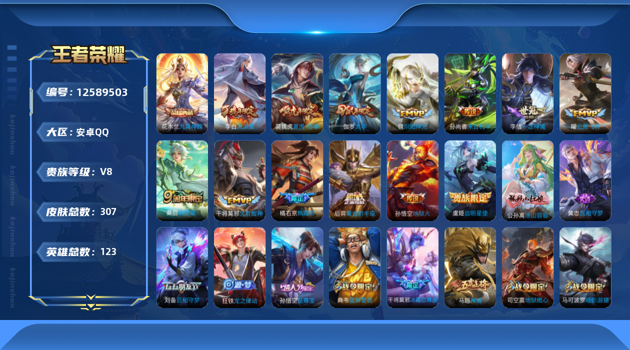[12589503]安卓Q-V6-尊贵铂金I段位-123英雄-307皮肤-1典藏-0珍品无双-0无双-0珍品传说-13传说-90史诗