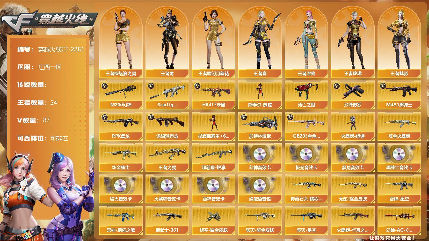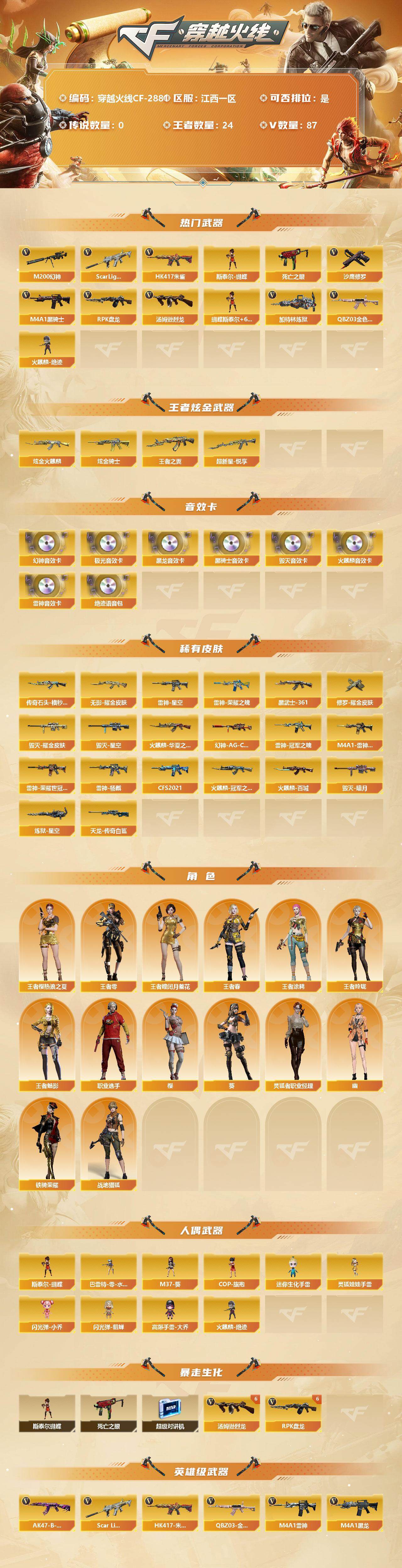 [12589978]江西一区-87V-24王者-3炫金 【热门武器】:QBZ03-金色蔷薇,Scar Light-白虎,HK417-朱雀,M200-幻神,死亡之眼,M4A1-黑骑士*2,汤姆逊-烈龙*6,RPK-盘龙*6,加特林-炼狱*3,斯泰尔-蝴蝶,火麒麟-绝迹,沙鹰-修罗*13 【王者炫金武器】:炫金火麒麟,炫金骑士*2,超新星-悦享,王者之翼 【音效卡】:M200-幻神音效卡,AK47-火麒麟音效卡,M4A1-雷神音效卡,M4A1-黑龙音效卡,M4A1-黑骑士音效卡,Barrett-毁灭音效卡,Barrett-极光音效卡,绝迹语音包 【稀有皮肤】:幻神-AG-CFPLS17冠军,雷神-荣耀之魄,雷神-星空,M4A1-雷神-CFS 2019,雷神-冠军之魄,雷神-杨戬,雷神-荣耀世冠AG,火麒麟-冠军之心,火麒麟-华夏之心,传奇石头-横秒之巅,火麒麟-百城,黑骑士-CFS2021,炼狱-星空,毁灭-暗月,毁灭耀金皮肤,毁灭-星空,AWM-天龙-传奇白鲨,无影耀金皮肤,AK47-黑武士-361,修罗耀金皮肤 【角色】:王者-瞳-闭月羞花,王者樱-热浪之夏,王者-零,王者春,王者涂鸦,王者玲珑,王者-魅影,灵狐者-职业经理,葵,樱,幽,战地猎狐,铁骑荣耀,职业选手 【人偶武器】:火麒麟-绝迹,斯泰尔-蝴蝶,巴雷特-零-水下丽影,M37-葵,COP-旗袍,迷你生化手雷*2,灵狐娃娃手雷,闪光弹-小乔,闪光弹-貂蝉,高爆手雷-大乔 【暴走生化】:斯泰尔-蝴蝶,死亡之眼,超级对讲机 【英雄级武器】:M4A1-武圣,QBZ03-金色蔷薇,Scar Light-白虎,HK417-朱雀,M4A1-雷神*3,M4A1-黑龙,M4A1-黑骑士*2,RPK-盘龙*6,加特林-炼狱*3,汤姆逊-烈龙*6,AK47-无影,AK47-火麒麟*3,AK12-天启,AN94-超新星*3,Barrett-毁灭*2,Barrett-极光*2,AWM-裁决,M200-幻神,AK47-黑鲨,M4A1-猎神,死神-雪域霜狐,AK-47-猩红传说,AK47-B-战神,AK47-B-常胜将军,M4A1-赤狱骑士,沙鹰-天神*2,沙鹰-修罗*13,擎天*5,屠龙*2 【特殊枪械】:蝴蝶斯泰尔+6烈龙,1白虎,2黑骑士,6烈龙,6盘龙,3炼狱,1蝴蝶斯泰尔
