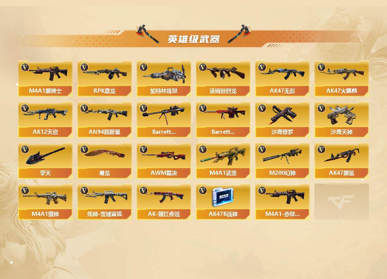 【英雄级武器】:M4A1-武圣,QBZ03-金色蔷薇,Scar Light-白虎,HK417-朱雀,M4A1-雷神*3,M4A1-黑龙,M4A1-黑骑士*2,RPK-盘龙*6,加特林-炼狱*3,汤姆逊-烈龙*6,AK47-无影,AK47-火麒麟*3,AK12-天启,AN94-超新星*3,Barrett-毁灭*2,Barrett-极光*2,AWM-裁决,M200-幻神,AK47-黑鲨,M4A1-猎神,死神-雪域霜狐,AK-47-猩红传说,AK47-B-战神,AK47-B-常胜将军,M4A1-赤狱骑士,沙鹰-天神*2,沙鹰-修罗*13,擎天*5,屠龙*2