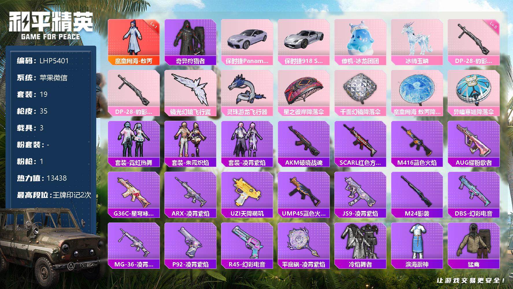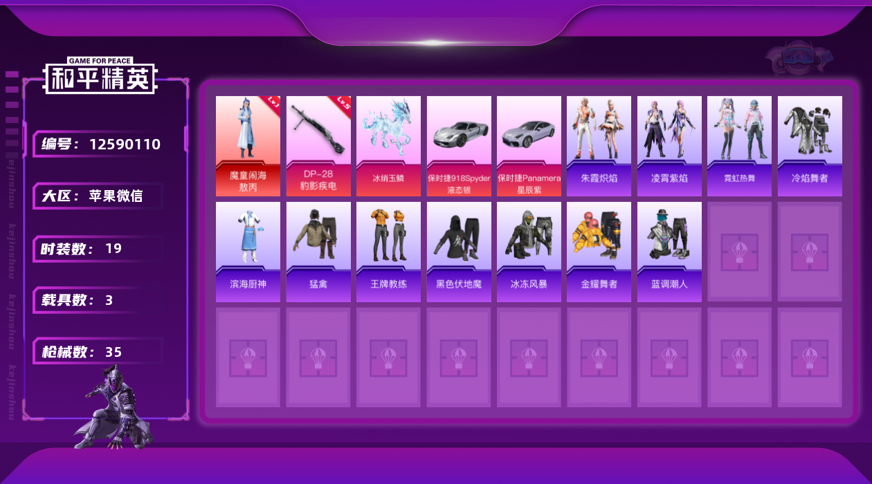 [12590110]【特价急出/详情看图】:苹果 微信-1神装-0粉装-1特效枪-3载具-2粉色飞行器-13438热力值-2王牌印记-19套装-35枪皮【红色神装等级】:魔童闹海-敖丙(一级)【红色角色神装】:魔童闹海-敖丙【热门品类】:套装-奇异狩猎者【粉色载具】:保时捷Panamera(星辰紫),保时捷918 Spyder(液态银),僚机-冰龙团团,冰绡玉鳞【粉色枪皮等级】:DP-28-豹影疾电(五级)【粉色枪皮】:DP-28-豹影疾电【粉色飞行器】:镜光幻境飞行翼,灵珠游龙飞行器