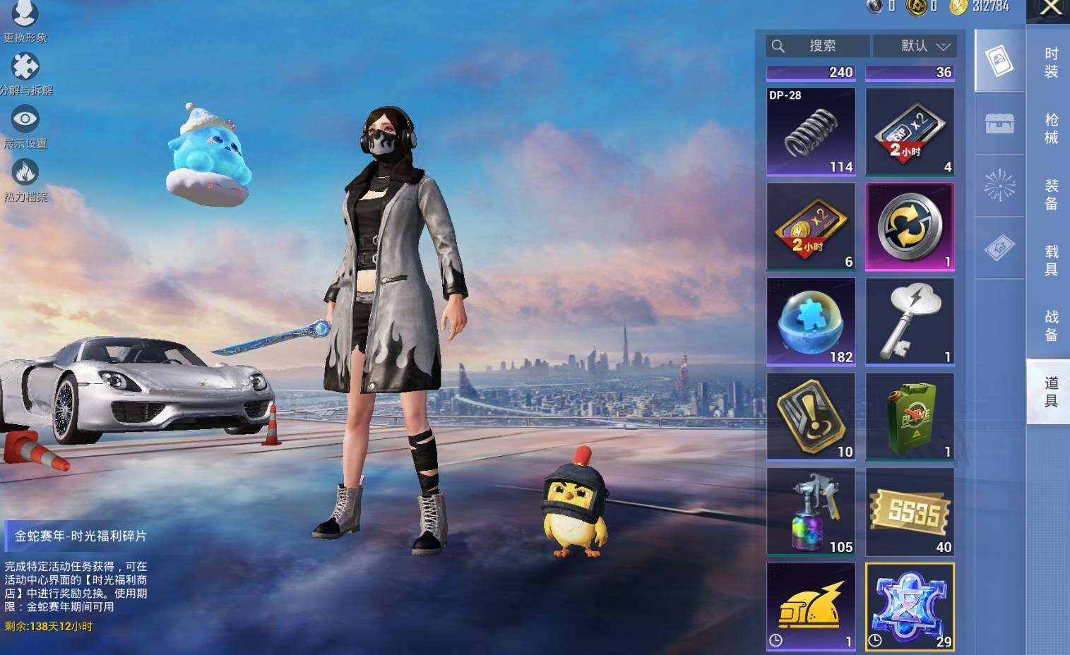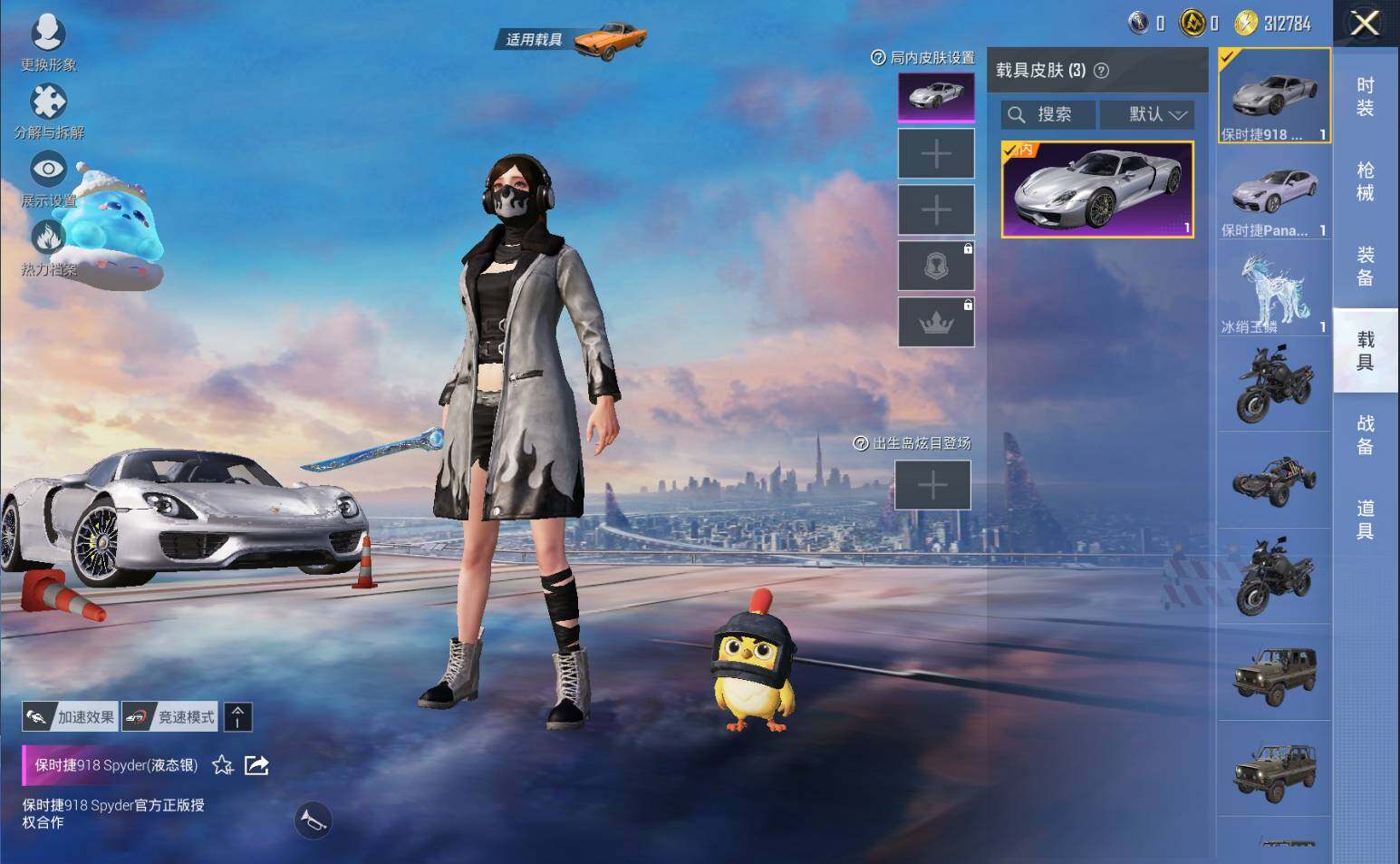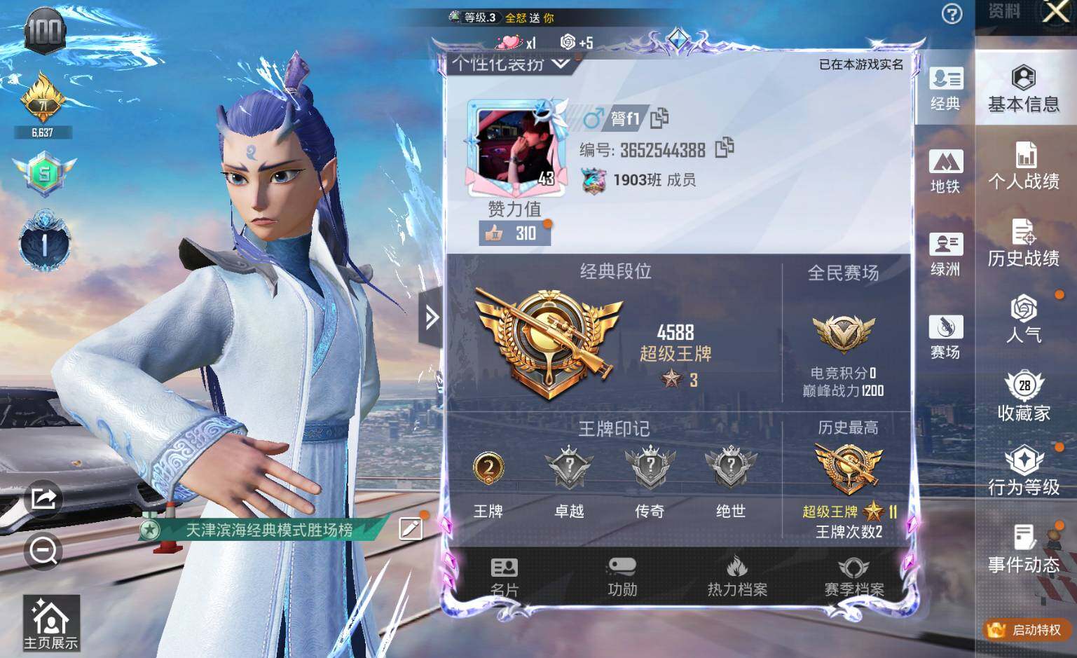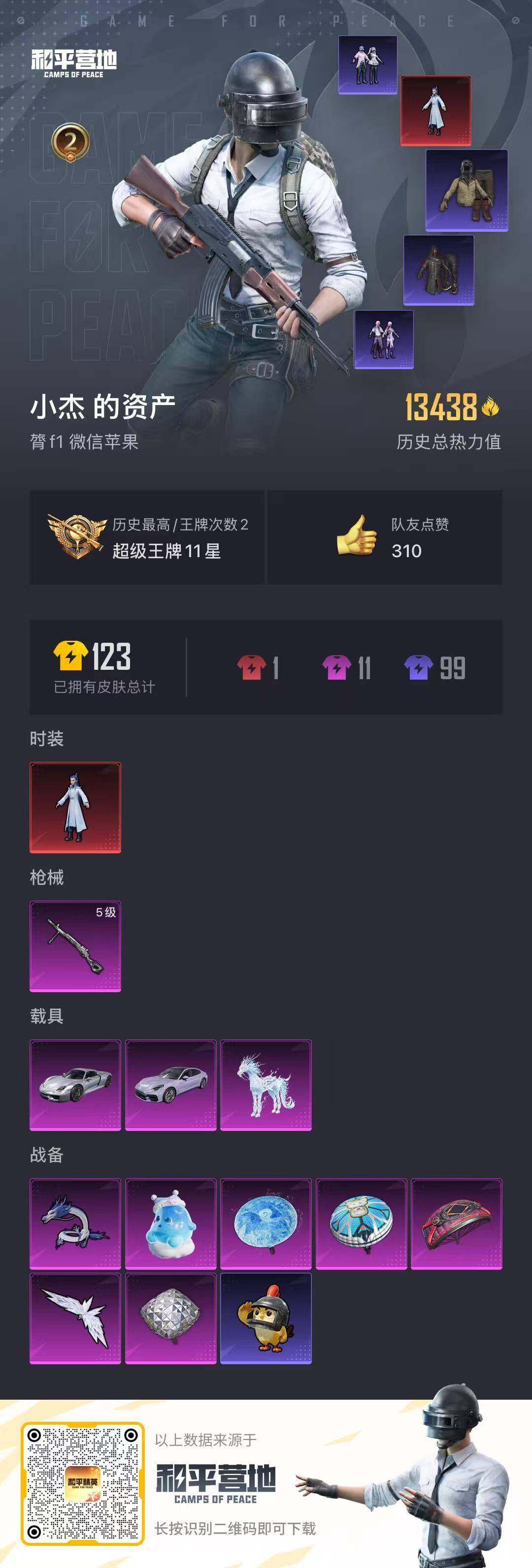 - [11968445]实名: 可修改 时装数: 390 载具数: 1 枪械数: 90 战备数: 80 热门装扮: 馨动时刻,暗夜玫瑰,暗夜魅影 载具: 特斯拉Roadster(水滴蓝)