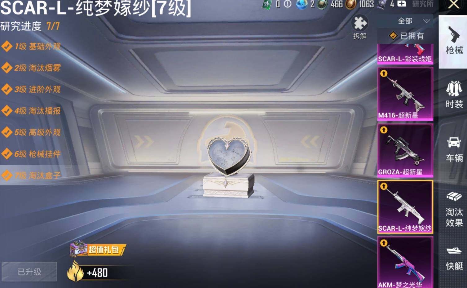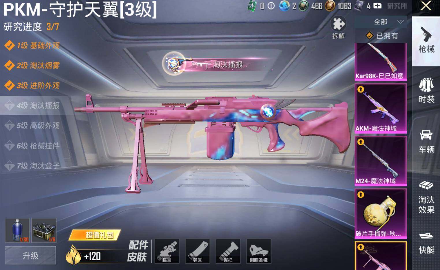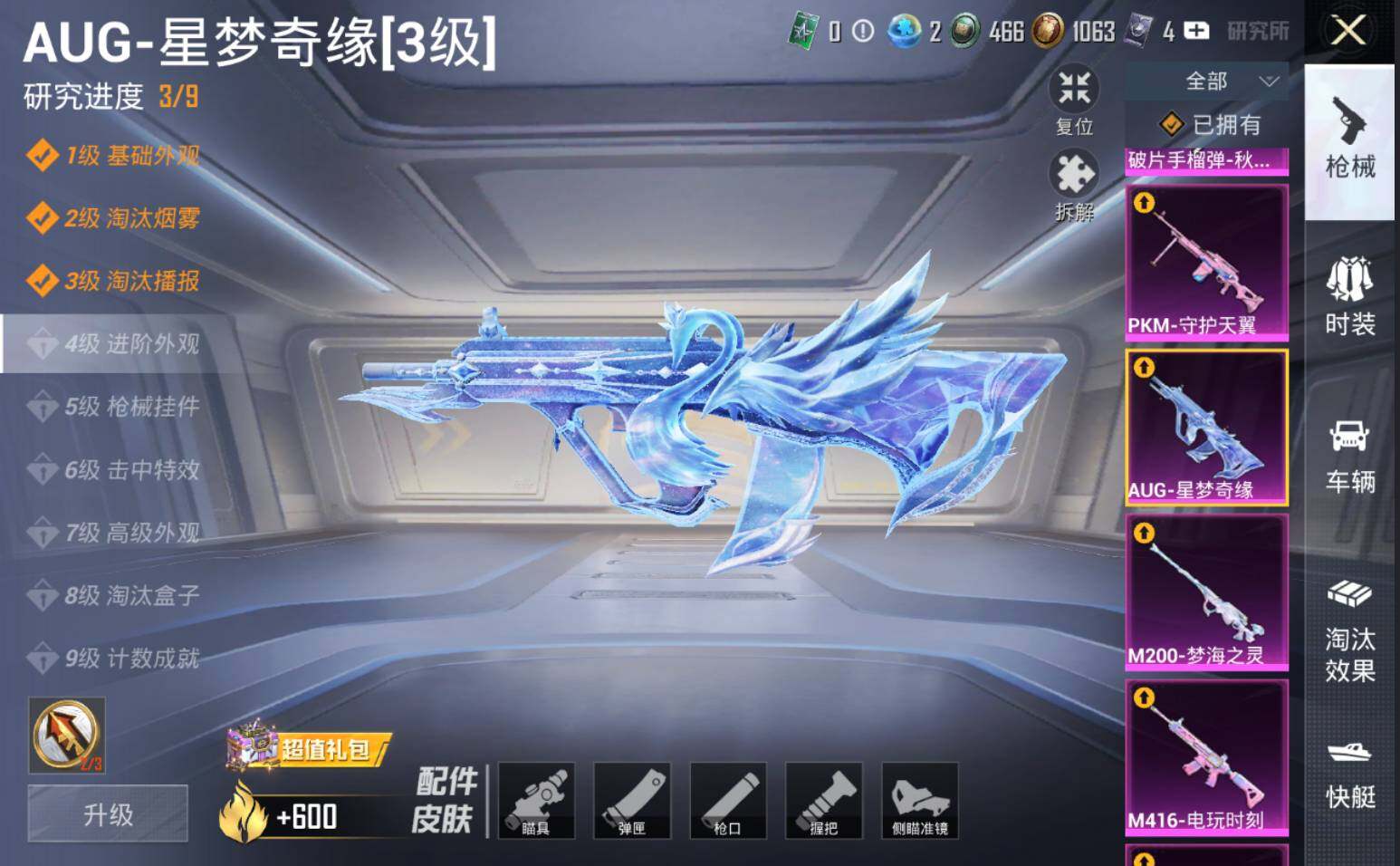 AKM-梦之光华,AKM-魔法神域,SCAR-L-纯梦嫁纱,SCAR-L-彩装战姬,M416-超新星,M416-电玩时刻,M416-女娲灵识,GROZA-超新星,AUG-星梦奇缘,Kar98K-巳巳如意,M24-魔法神域,M200-梦海之灵,PKM-守护天翼,破片手榴弹-秋玉花灯