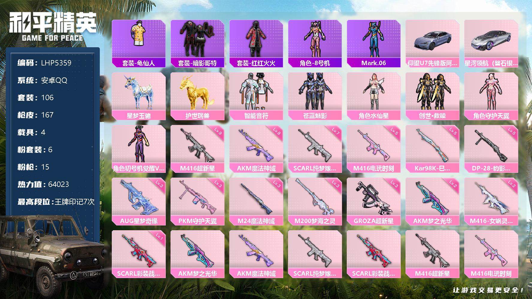 [12590106]地铁满天赋【特价急出/详情看图】:安卓 手Q-6粉装-15特效枪-4载具-4粉色飞行器-6.4w热力值-7王牌印记-106套装-167枪皮【热门品类】:套装-龟仙人,套装-暗影哥特,套装-红红火火,角色-8号机,角色-Mark.06【粉色载具】:仰望U7(阿盖尔紫),星河领航(磐石银),星梦玉骢,护世瑞兽【粉色套装】:粉装-智能音符,粉装-苍蓝魅影,角色-水仙星,套装-创世·救赎,角色-守护天翼,角色-初号机 觉醒Ver.【粉色枪皮等级】:AKM-梦之光华(二级),AKM-魔法神域(八级),SCAR-L-纯梦嫁纱(七级),SCAR-L-彩装战姬(一级),M416-超新星(九级),M416-电玩时刻(五级),M416-女娲灵识(二级),GROZA-超新星(三级),AUG-星梦奇缘(三级),Kar98K-巳巳如意(五级),M24-魔法神域(三级),M200-梦海之灵(三级),DP-28-豹影疾电(五级),PKM-守护天翼(三级)【粉色枪皮】:AKM-梦之光华,AKM-魔法神域,SCAR-L-纯梦嫁纱,SCAR-L-彩装战姬,M416-超新星,M416-电玩时刻,M416-女娲灵识,GROZA-超新星,AUG-星梦奇缘,Kar98K-巳巳如意,M24-魔法神域,M200-梦海之灵,DP-28-豹影疾电,PKM-守护天翼,破片手榴弹-秋玉花灯【粉色飞行器】:千面幻镜飞行器,幻海精灵飞行器,凤舞九天飞行器,万象金身飞行器