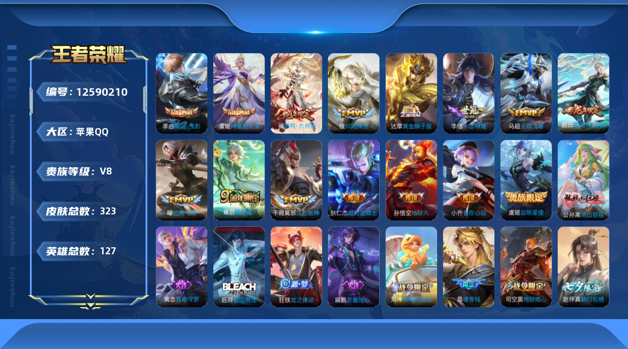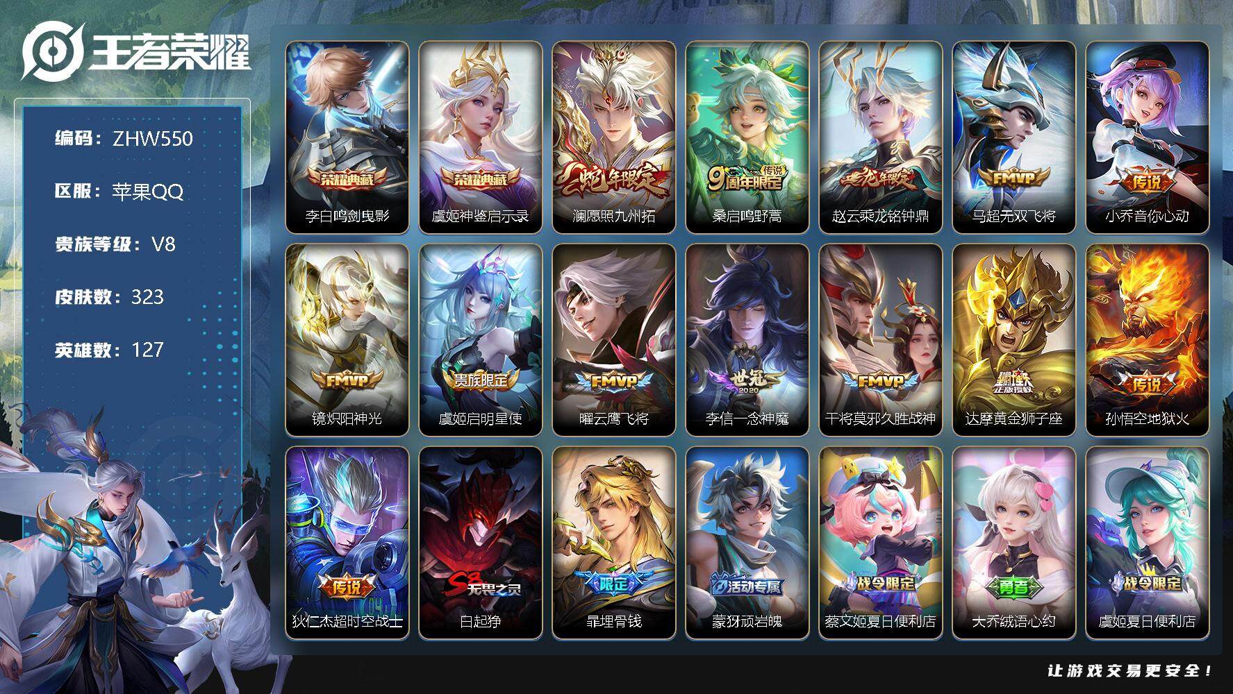 [12590210]【特价急出/详情看图】:苹果Q-V8-至尊星耀II段位-127英雄-323皮肤-2典藏-13传说-99史诗 【英雄全皮】:钟馗全皮,赵怀真全皮,空空儿全皮,影全皮 【荣耀典藏】:李白鸣剑曳影,虞姬神鉴启示录 【传说皮肤】:澜愿照九州拓,桑启鸣野蒿,赵云乘龙铭钟鼎,马超无双飞将,小乔音你心动,镜炽阳神光,虞姬启明星使,曜云鹰飞将,李信一念神魔,干将莫邪久胜战神,达摩黄金狮子座,孙悟空地狱火,狄仁杰超时空战士 【限定皮肤】:白起狰,暃埋骨钱,蒙犽顽岩魄,蔡文姬夏日便利店,大乔绒语心约,虞姬夏日便利店,姜子牙天穹之誓,李白谪仙醉月,狄仁杰阴阳师,赵云皇家上将,嬴政白昼王子,鲁班七号狮舞东方,庄周高山流水,高渐离玩趣恶龙,阿轲迷踪丽影,芈月重明,吕布猎兽之王,元歌云间偶戏,夏侯惇朔风刀,曹操烛龙,典韦穷奇,马可波罗山海玄木吟,狄仁杰魔术师,狄仁杰万华元夜,项羽海滩派对,老夫子醍醐杖,关羽冰锋战神,程咬金演武夺筹,韩信逐梦之影,亚瑟潮玩骑士王,孙悟空美猴王,孙悟空大圣娶亲,牛魔御旌,李元芳银河之约,虞姬霸王别姬,虞姬启明星使,钟馗神迹守卫,钟馗驱傩正仪,杨玉环遇见飞天,雅典娜黎明之约,鬼谷子原初探秘者,铠青龙志,苏烈千军破阵,百里玄策原初追逐者,弈星混沌棋,明世隐疑决卦,裴擒虎李小龙,狂铁御狮,米莱狄御霄,云中君纤云弄巧,盾山御銮,嫦娥拒霜思,西施玲珑珍味,鲁班大师探海日志,戈娅驭风魔法,艾琳流音漫舞,赵怀真鹤归松栖,司空震地狱燃心,阿古朵江河有灵,张良古海寻踪,蒙犽百解令,蒙恬荣光圣徽,高渐离燃音魔法,妲己灵卜魔法,鬼谷子天穹祈灯,姬小满妄想食味,赵云乘龙铭钟鼎,沈梦溪龙舞盛年,鲁班七号蔬乡物语,李元芳蔬乡物语,刘邦剑破天穹,程咬金群星魔术团,镜青焰无极,项羽苍威无极,刘备异域游侠,周瑜熔金海岸 【年限皮肤】:铠青龙志,孙悟空美猴王,马可波罗山海玄木吟,赵云乘龙铭钟鼎 【赛季限定】:白起狰,芈月重明,夏侯惇朔风刀,曹操烛龙,典韦穷奇,狄仁杰万华元夜,老夫子醍醐杖,程咬金演武夺筹,张良古海寻踪,牛魔御旌,钟馗驱傩正仪,雅典娜黎明之约,鬼谷子原初探秘者,苏烈千军破阵,百里玄策原初追逐者,弈星混沌棋,明世隐疑决卦,狂铁御狮,米莱狄御霄,盾山御銮,鲁班大师探海日志,鬼谷子天穹祈灯,蒙恬荣光圣徽,刘邦剑破天穹,姜子牙天穹之誓 【战令限定】:蔡文姬夏日便利店,虞姬夏日便利店,嬴政白昼