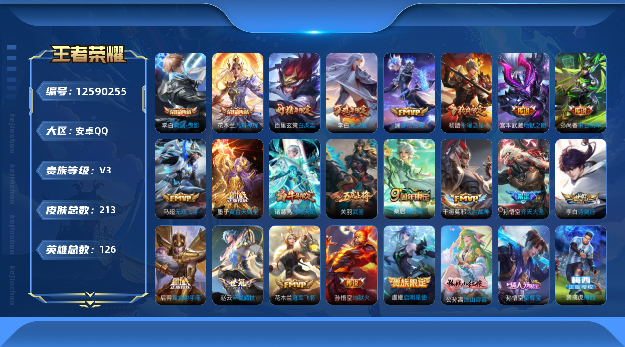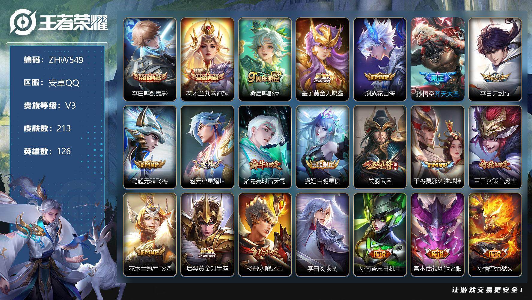 [12590255]【特价急出/详情看图】:安卓Q-V3-至尊星耀II段位-126英雄-213皮肤-2典藏-19传说-54史诗 【英雄全皮】:影全皮 【荣耀典藏】:李白鸣剑曳影,花木兰九霄神辉 【传说皮肤】:桑启鸣野蒿,墨子黄金天蝎座,澜逐花归海,孙悟空齐天大圣,李白诗剑行,马超无双飞将,赵云淬星耀世,诸葛亮时雨天司,虞姬启明星使,关羽武圣,干将莫邪久胜战神,百里玄策白虎志,花木兰冠军飞将,后羿黄金射手座,杨戬永曜之星,李白凤求凰,孙尚香末日机甲,宫本武藏地狱之眼,孙悟空地狱火 【限定皮肤】:白起狰,姜子牙天穹之誓,李白谪仙醉月,狄仁杰阴阳师,虞姬凯尔特女王,赵云皇家上将,孙尚香蔷薇恋人,芈月重明,元歌无心,夏侯惇朔风刀,甄姬落雪兰心,曹操烛龙,典韦穷奇,典韦岱宗,狄仁杰魔术师,狄仁杰万华元夜,达摩沙漠行僧,项羽海滩派对,关羽冰锋战神,关羽武圣,韩信飞衡,韩信傲雪梅枪,兰陵王金庭之子,孙悟空至尊宝,孙悟空齐天大圣,牛魔御旌,后羿辉光之辰,李元芳云中旅人,虞姬启明星使,杨戬永曜之星,蔡文姬繁星吟游,太乙真人饕餮,鬼谷子原初探秘者,诸葛亮时雨天司,百里玄策白虎志,百里玄策原初追逐者,百里守约朱雀志,弈星混沌棋,沈梦溪大漠名商,明世隐疑决卦,裴擒虎李小龙,裴擒虎擒涛扼浪,狂铁御狮,米莱狄御霄,云中君纤云弄巧,盾山御銮,上官婉儿梁祝,嫦娥拒霜思,鲁班大师探海日志,桑启海盐诗旅,阿古朵江河有灵,张良古海寻踪,裴擒虎梅西,蒙犽百解令,蒙恬荣光圣徽,鬼谷子天穹祈灯,沈梦溪龙舞盛年,刘邦剑破天穹,程咬金群星魔术团 【年限皮肤】:百里玄策白虎志,百里守约朱雀志,李白凤求凰,杨戬永曜之星,后羿辉光之辰,诸葛亮时雨天司,韩信飞衡,典韦岱宗,关羽武圣 【赛季限定】:白起狰,芈月重明,夏侯惇朔风刀,曹操烛龙,典韦穷奇,狄仁杰万华元夜,达摩沙漠行僧,兰陵王金庭之子,张良古海寻踪,牛魔御旌,李元芳云中旅人,虞姬凯尔特女王,太乙真人饕餮,鬼谷子原初探秘者,百里玄策原初追逐者,弈星混沌棋,沈梦溪大漠名商,明世隐疑决卦,裴擒虎擒涛扼浪,狂铁御狮,米莱狄御霄,盾山御銮,鲁班大师探海日志,桑启海盐诗旅,鬼谷子天穹祈灯,蒙恬荣光圣徽,刘邦剑破天穹,姜子牙天穹之誓 【战令限定】:甄姬落雪兰心 【史诗皮肤】:露娜紫霞仙子,阿轲暗夜猫娘,赵云皇家上将,貂蝉圣诞恋歌,甄姬冰雪圆舞曲,狄仁杰魔术师,孙尚香蔷薇恋人,孙尚香水果甜心,嬴政