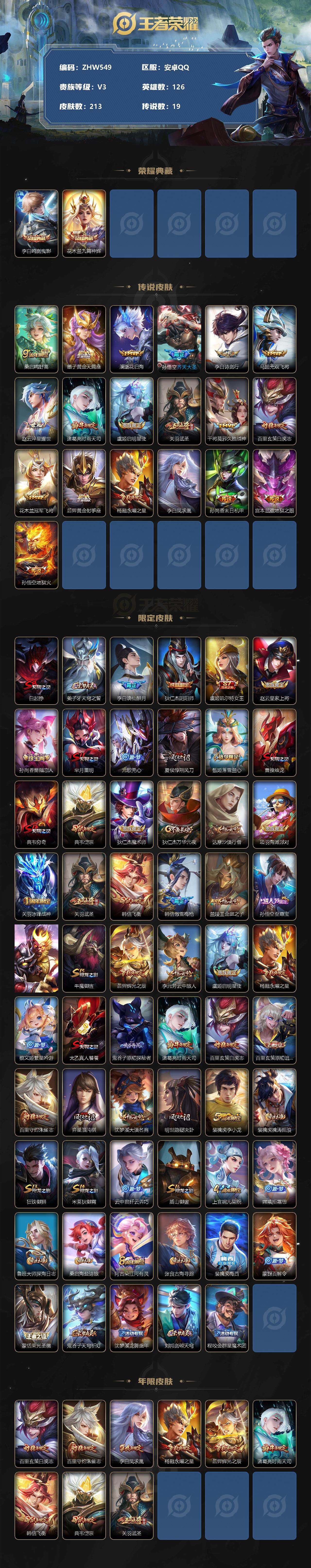 [12590255]【特价急出/详情看图】:安卓Q-V3-至尊星耀II段位-126英雄-213皮肤-2典藏-19传说-54史诗