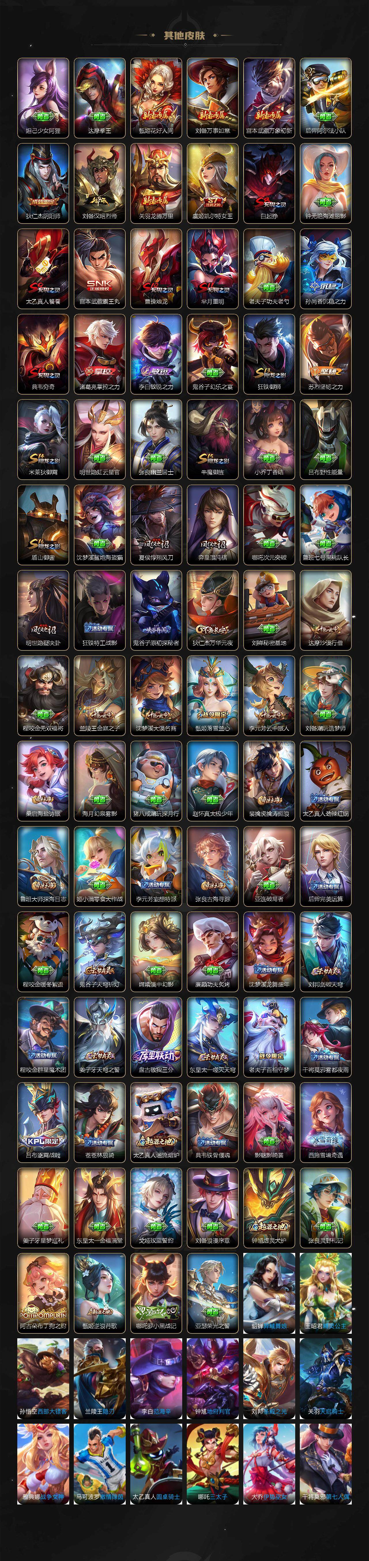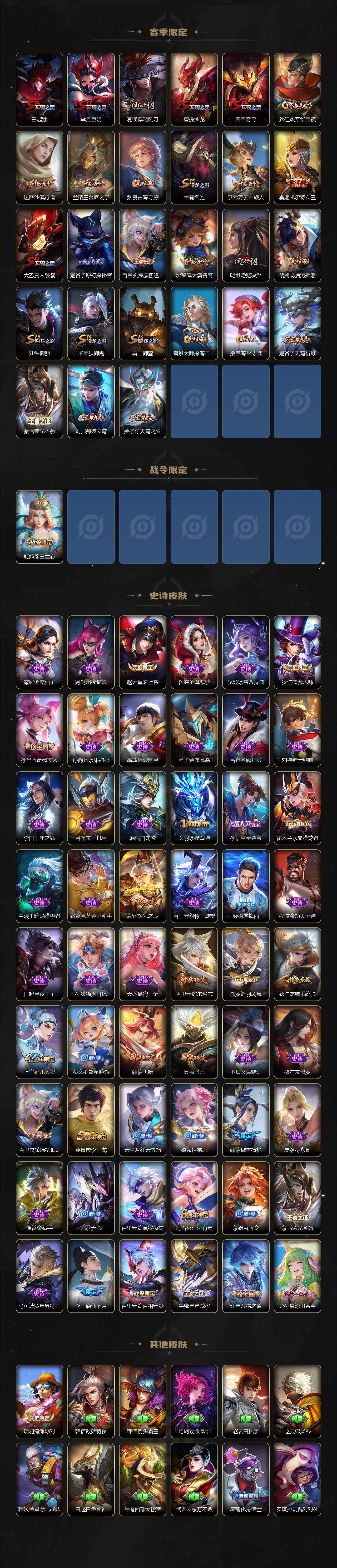 【限定皮肤】:白起狰,姜子牙天穹之誓,李白谪仙醉月,狄仁杰阴阳师,虞姬凯尔特女王,赵云皇家上将,孙尚香蔷薇恋人,芈月重明,元歌无心,夏侯惇朔风刀,甄姬落雪兰心,曹操烛龙,典韦穷奇,典韦岱宗,狄仁杰魔术师,狄仁杰万华元夜,达摩沙漠行僧,项羽海滩派对,关羽冰锋战神,关羽武圣,韩信飞衡,韩信傲雪梅枪,兰陵王金庭之子,孙悟空至尊宝,孙悟空齐天大圣,牛魔御旌,后羿辉光之辰,李元芳云中旅人,虞姬启明星使,杨戬永曜之星,蔡文姬繁星吟游,太乙真人饕餮,鬼谷子原初探秘者,诸葛亮时雨天司,百里玄策白虎志,百里玄策原初追逐者,百里守约朱雀志,弈星混沌棋,沈梦溪大漠名商,明世隐疑决卦,裴擒虎李小龙,裴擒虎擒涛扼浪,狂铁御狮,米莱狄御霄,云中君纤云弄巧,盾山御銮,上官婉儿梁祝,嫦娥拒霜思,鲁班大师探海日志,桑启海盐诗旅,阿古朵江河有灵,张良古海寻踪,裴擒虎梅西,蒙犽百解令,蒙恬荣光圣徽,鬼谷子天穹祈灯,沈梦溪龙舞盛年,刘邦剑破天穹,程咬金群星魔术团