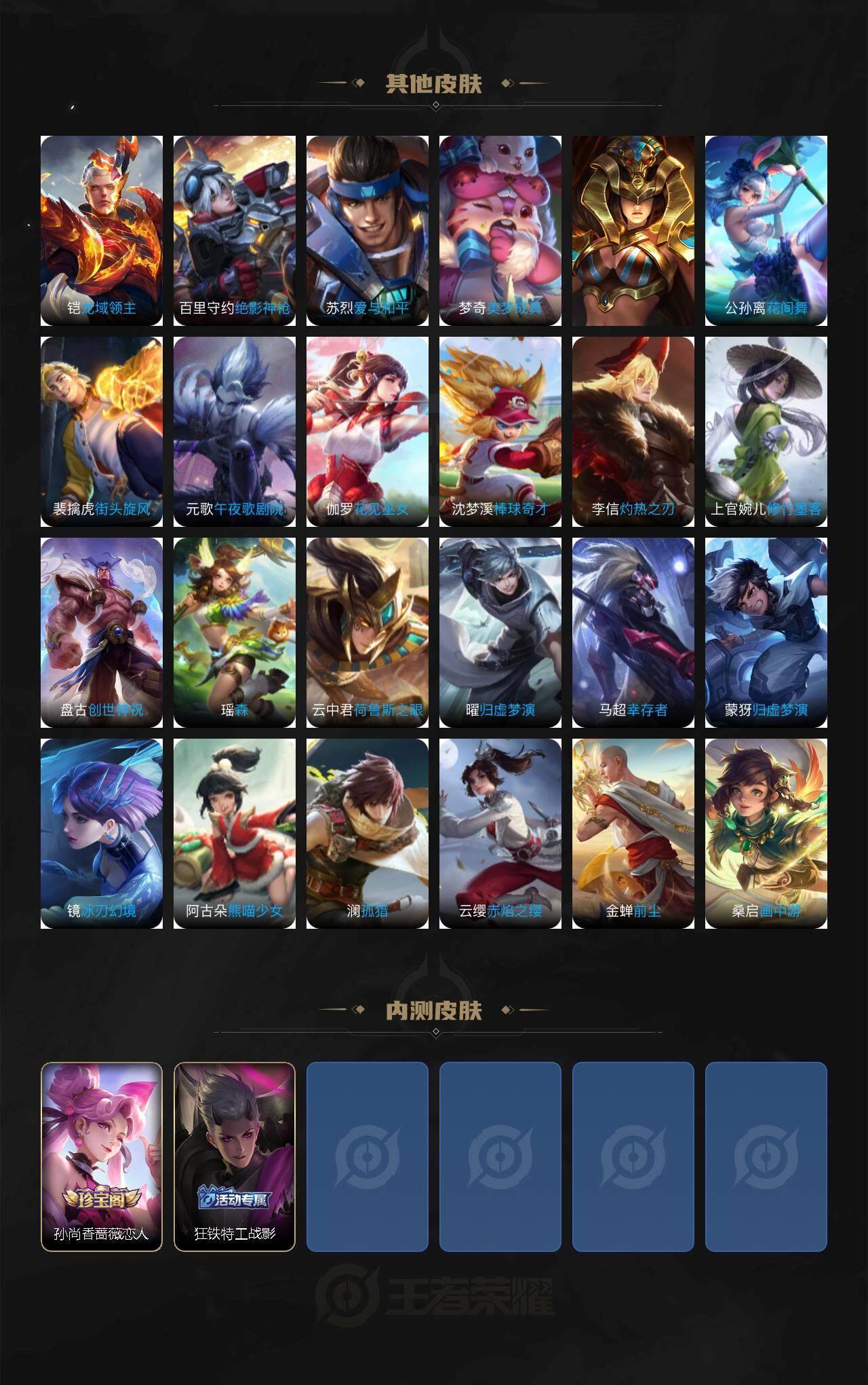 虞姬凯尔特女王,白起狰,太乙真人饕餮,曹操烛龙,芈月重明,典韦穷奇,狂铁御狮,米莱狄御霄,牛魔御旌,盾山御銮,夏侯惇朔风刀,明世隐疑决卦,鬼谷子原初探秘者,狄仁杰万华元夜,弈星混沌棋,达摩沙漠行僧,兰陵王金庭之子,沈梦溪大漠名商,李元芳云中旅人,桑启海盐诗旅,裴擒虎擒涛扼浪,鲁班大师探海日志,张良古海寻踪