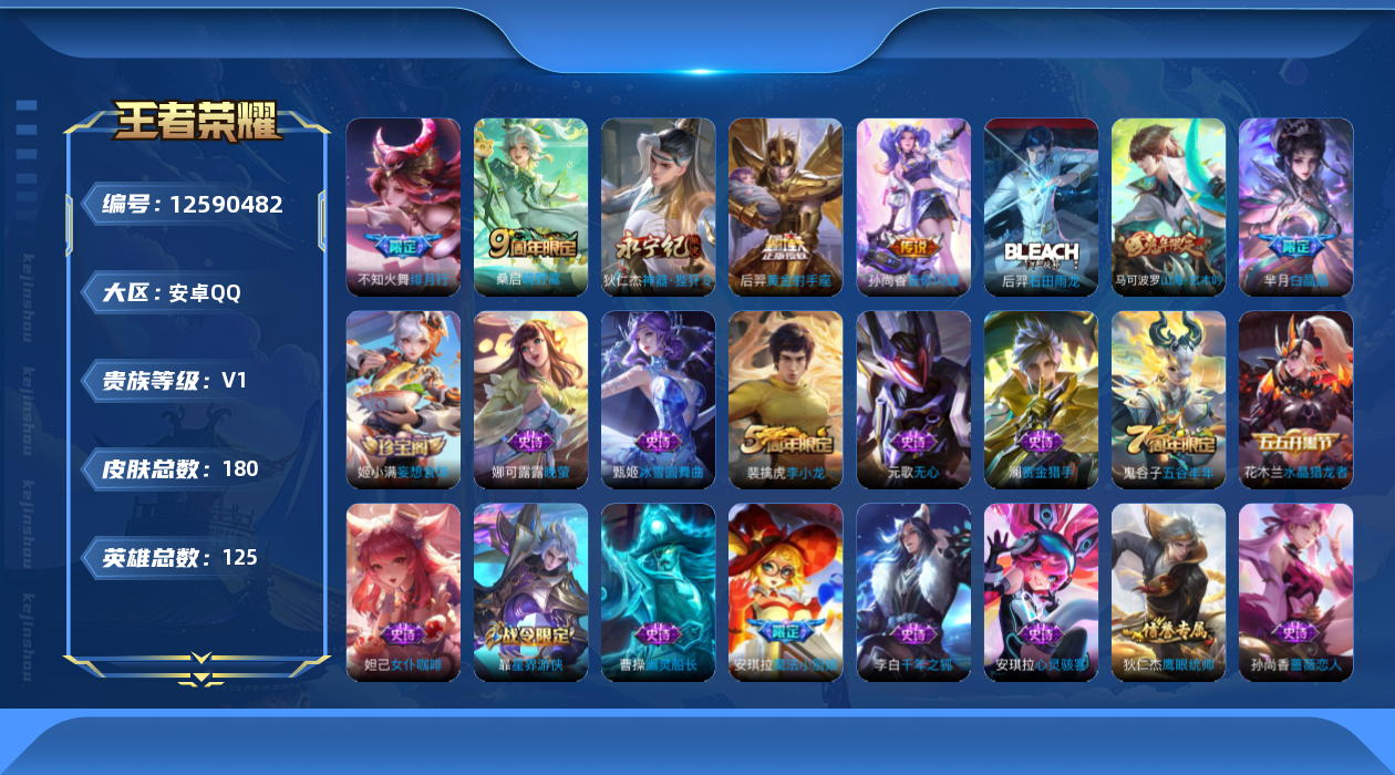 - PX_2093954-实名: 可修改 贵族等级: V9 英雄数: 125 皮肤数: 318 荣耀水晶: 无限飓风号,全息碎影,银白咏叹调 珍品传说: 酷洛米之心,朽木白哉 星传说: 幽冥之眼 传说皮: 黄金狮子座,黄金射手座,云鹰飞将,黄金白羊座,猫影幻舞,久胜战神,云霓雀翎,末日机甲-孙尚香,仲夏夜之梦,地狱之眼,末日机甲-孙策 限定皮: 冰锋战神,遇见飞天,李小龙,游园惊梦,梁祝,时雨天司,引