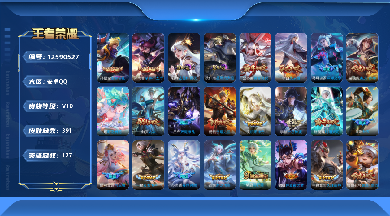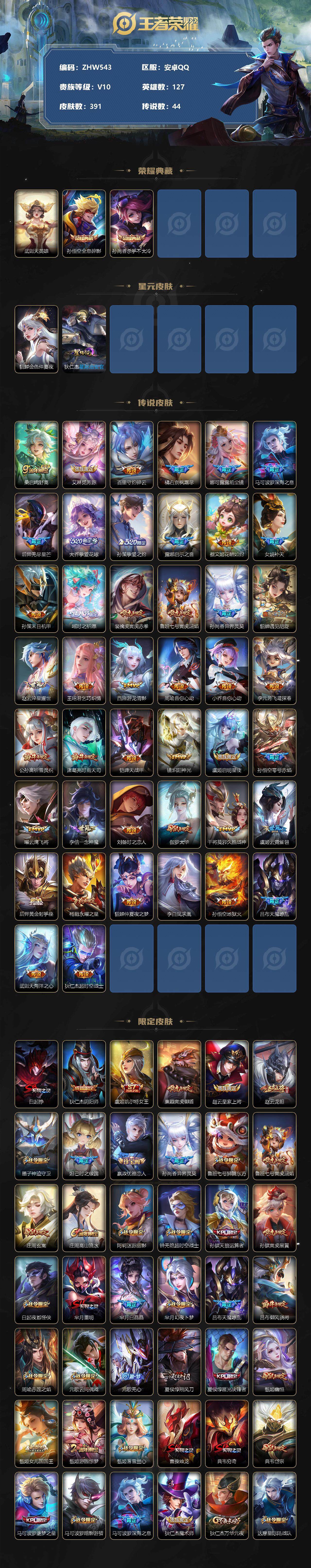 [12590527]【特价急出/详情看图】:安卓Q-V10-至尊星耀II段位-127英雄-391皮肤-2典藏-44传说-129史诗