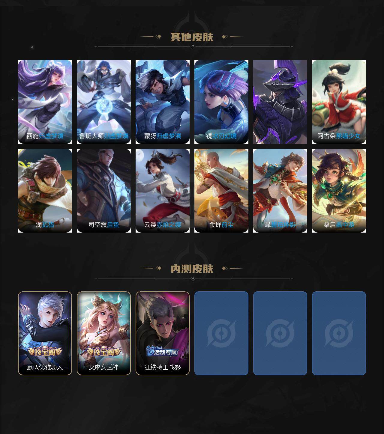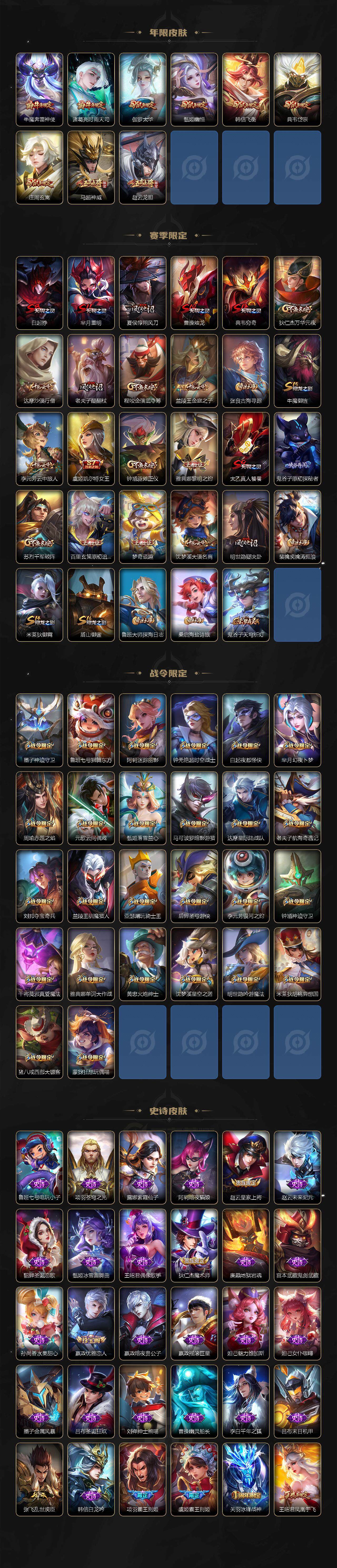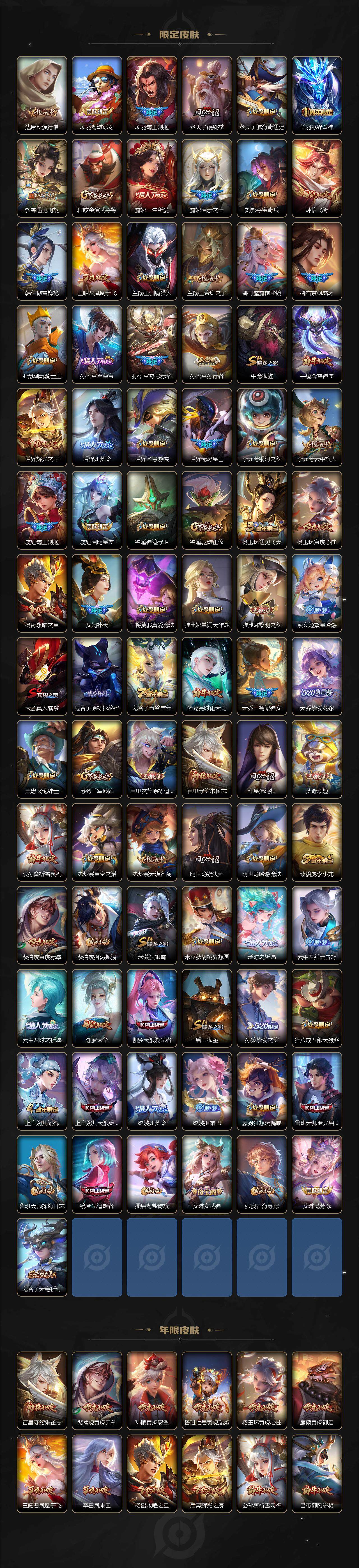 【限定皮肤】:白起狰,狄仁杰阴阳师,虞姬凯尔特女王,廉颇寅虎御盾,赵云皇家上将,赵云龙胆,墨子神迹守卫,妲己时之彼端,嬴政优雅恋人,孙尚香异界灵契,鲁班七号狮舞东方,鲁班七号寅虎瑞焰,庄周玄嵩,庄周高山流水,阿轲迷踪丽影,钟无艳超时空战士,孙膑天狼运算者,孙膑寅虎展翼,白起夜都怪侠,芈月重明,芈月白晶晶,芈月幻夜卜梦,吕布天魔缭乱,吕布御风骁将,周瑜赤莲之焰,元歌云间偶戏,元歌无心,夏侯惇朔风刀,夏侯惇匿光决锋者,甄姬幽恒,甄姬女儿国国王,甄姬游园惊梦,甄姬落雪兰心,曹操烛龙,典韦穷奇,典韦岱宗,马可波罗逐梦之星,马可波罗暗影游猎,马可波罗深海之息,狄仁杰魔术师,狄仁杰万华元夜,达摩星际陆战队,达摩沙漠行僧,项羽海滩派对,项羽霸王别姬,老夫子醍醐杖,老夫子航海奇遇记,关羽冰锋战神,貂蝉遇见胡旋,程咬金演武夺筹,露娜一生所爱,露娜启示之音,刘邦夺宝奇兵,韩信飞衡,韩信傲雪梅枪,王昭君凤凰于飞,兰陵王驯魔猎人,兰陵王金庭之子,娜可露露前尘镜,橘右京枫霜尽,亚瑟潮玩骑士王,孙悟空至尊宝,孙悟空零号赤焰,孙悟空孙行者,牛魔御旌,牛魔奔雷神使,后羿辉光之辰,后羿如梦令,后羿圣弓游侠,后羿无尽星芒,李元芳银河之约,李元芳云中旅人,虞姬霸王别姬,虞姬启明星使,钟馗神迹守卫,钟馗驱傩正仪,杨玉环遇见飞天,