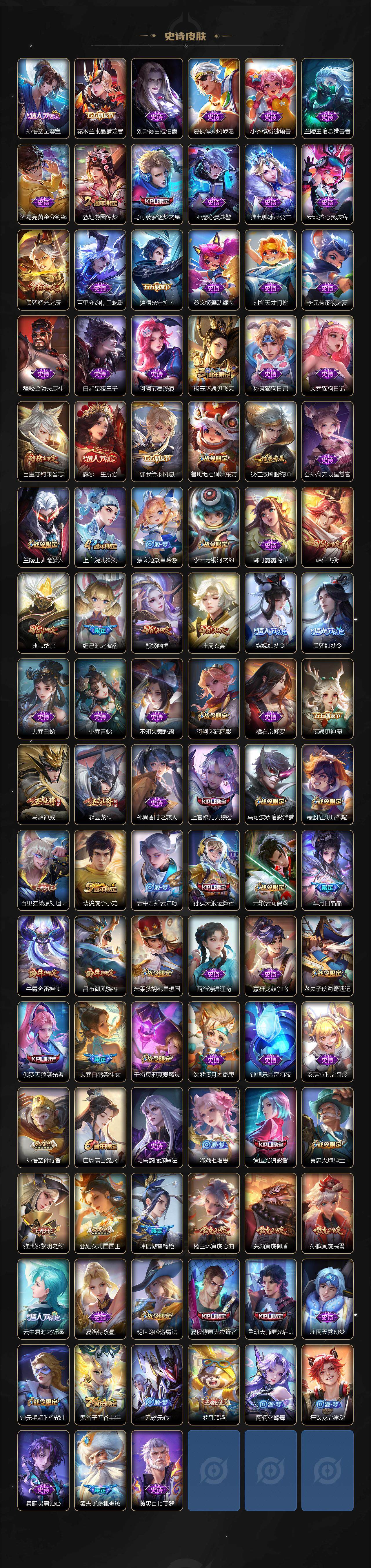 虞姬凯尔特女王,白起狰,太乙真人饕餮,曹操烛龙,芈月重明,典韦穷奇,米莱狄御霄,牛魔御旌,盾山御銮,夏侯惇朔风刀,明世隐疑决卦,老夫子醍醐杖,鬼谷子原初探秘者,狄仁杰万华元夜,程咬金演武夺筹,钟馗驱傩正仪,苏烈千军破阵,钟馗神迹守卫,鲁班七号狮舞东方,沈梦溪星空之诺,李元芳银河之约,刘邦夺宝奇兵,马可波罗暗影游猎,蒙犽狂想玩偶喵,元歌云间偶戏,弈星混沌棋,达摩沙漠行僧,兰陵王金庭之子,沈梦溪大漠名商,李元芳云中旅人,桑启海盐诗旅,裴擒虎擒涛扼浪,鲁班大师探海日志,张良古海寻踪