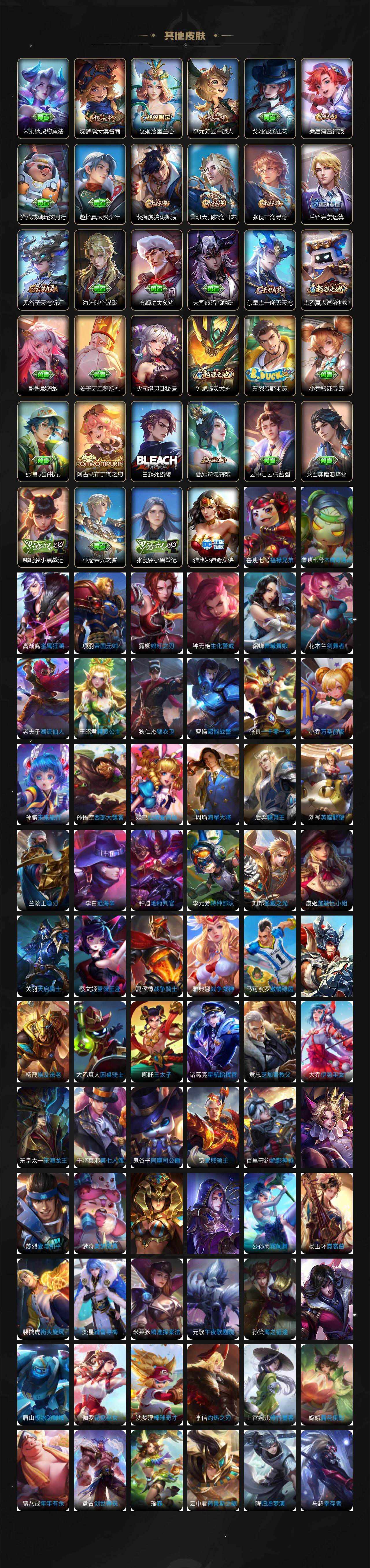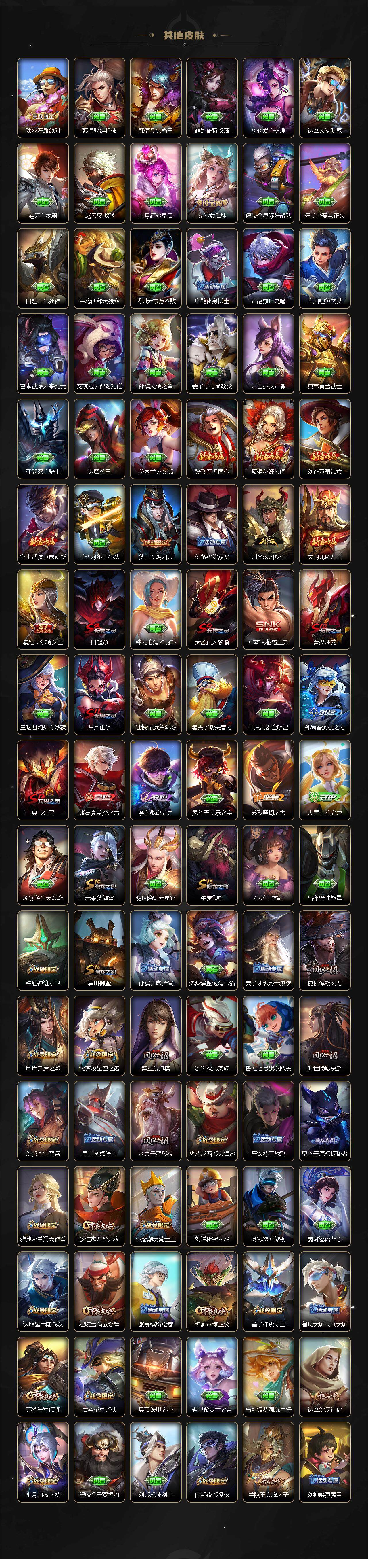 小乔青蛇,大乔白蛇,瑶遇见神鹿,娜可露露晚萤,伽罗箭羽风息,李元芳逐浪之夏,不知火舞魅语,公孙离无限星赏官,大乔猫狗日记,孙策猫狗日记,阿轲节奏热浪,露娜紫霞仙子,诸葛亮黄金分割率,王昭君偶像歌手,韩信白龙吟,项羽苍穹之光,孙尚香时之恋人,阿轲暗夜猫娘,雅典娜冰冠公主,吕布末日机甲,鲁班七号电玩小子,蒙犽龙鼓争鸣,橘右京修罗,嬴政摇滚巨星,刘禅绅士熊喵,刘禅天才门将,白起星夜王子,安琪拉心灵骇客,安琪拉时之奇旅,程咬金功夫厨神,刘邦德古拉伯爵,兰陵王暗隐猎兽者,曹操幽灵船长,宫本武藏鬼剑武藏,司马懿暗渊魔法,亚瑟心灵战警,钟馗乐园奇幻夜,蔡文姬舞动绿茵,廉颇地狱岩魂,西施诗语江南,小乔缤纷独角兽,夏侯惇乘风破浪,花木兰水晶猎龙者,铠曙光守护者,墨子金属风暴,百里玄策原初追逐者,吕布圣诞狂欢,貂蝉圣诞恋歌,百里守约特工魅影,嬴政暗夜贵公子,嫦娥拒霜思,雅典娜黎明之约,李白千年之狐,夏洛特永昼,庄周天秀·幻梦