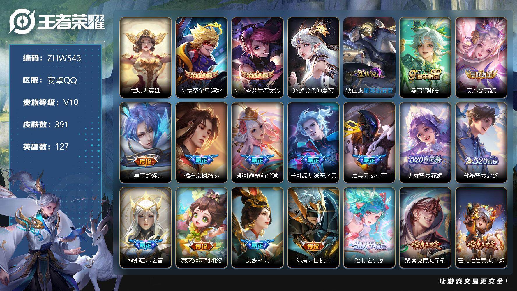 [12590527]【特价急出/详情看图】:安卓Q-V10-至尊星耀II段位-127英雄-391皮肤-2典藏-44传说-129史诗 【英雄全皮】:娜可露露全皮,橘右京全皮,钟馗全皮,鲁班大师全皮,影全皮 【荣耀典藏】:武则天英雄,孙悟空全息碎影,孙尚香杀手不太冷 【传说皮肤】:桑启鸣野蒿,艾琳觅芳踪,百里守约碎云,橘右京枫霜尽,娜可露露前尘镜,马可波罗深海之息,后羿无尽星芒,大乔挚爱花嫁,孙策挚爱之约,露娜启示之音,蔡文姬花朝如约,女娲补天,孙策末日机甲,瑶时之祈愿,裴擒虎寅虎赤拳,鲁班七号寅虎瑞焰,孙尚香异界灵契,貂蝉遇见胡旋,赵云淬星耀世,王昭君乞巧织情,西施游龙清影,周瑜音你心动,小乔音你心动,李元芳飞鸢探春,公孙离祈雪灵祝,诸葛亮时雨天司,铠绛天战甲,镜炽阳神光,虞姬启明星使,孙悟空零号赤焰,曜云鹰飞将,李信一念神魔,刘备时之恋人,伽罗太华,干将莫邪久胜战神,虞姬云霓雀翎,后羿黄金射手座,杨戬永曜之星,貂蝉仲夏夜之梦,李白凤求凰,孙悟空地狱火,吕布天魔缭乱,武则天海洋之心,狄仁杰超时空战士 【限定皮肤】:白起狰,狄仁杰阴阳师,虞姬凯尔特女王,廉颇寅虎御盾,赵云皇家上将,赵云龙胆,墨子神迹守卫,妲己时之彼端,嬴政优雅恋人,孙尚香异界灵契,鲁班七号狮舞东方,鲁班七号寅虎瑞焰,庄周玄嵩,庄周高山流水,阿轲迷踪丽影,钟无艳超时空战士,孙膑天狼运算者,孙膑寅虎展翼,白起夜都怪侠,芈月重明,芈月白晶晶,芈月幻夜卜梦,吕布天魔缭乱,吕布御风骁将,周瑜赤莲之焰,元歌云间偶戏,元歌无心,夏侯惇朔风刀,夏侯惇匿光决锋者,甄姬幽恒,甄姬女儿国国王,甄姬游园惊梦,甄姬落雪兰心,曹操烛龙,典韦穷奇,典韦岱宗,马可波罗逐梦之星,马可波罗暗影游猎,马可波罗深海之息,狄仁杰魔术师,狄仁杰万华元夜,达摩星际陆战队,达摩沙漠行僧,项羽海滩派对,项羽霸王别姬,老夫子醍醐杖,老夫子航海奇遇记,关羽冰锋战神,貂蝉遇见胡旋,程咬金演武夺筹,露娜一生所爱,露娜启示之音,刘邦夺宝奇兵,韩信飞衡,韩信傲雪梅枪,王昭君凤凰于飞,兰陵王驯魔猎人,兰陵王金庭之子,娜可露露前尘镜,橘右京枫霜尽,亚瑟潮玩骑士王,孙悟空至尊宝,孙悟空零号赤焰,孙悟空孙行者,牛魔御旌,牛魔奔雷神使,后羿辉光之辰,后羿如梦令,后羿圣弓游侠,后羿无尽星芒,李元芳银河之约,李元芳云中旅人,虞姬霸王别姬,虞姬启明星使,钟馗神迹守卫,钟馗驱傩正仪,杨玉环遇见飞天,