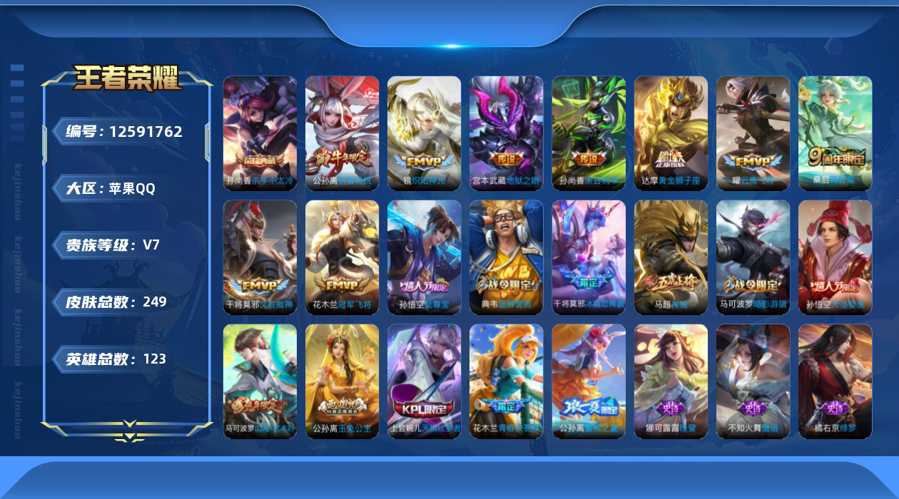 [12591762]苹果Q-V0-永恒钻石III段位-123英雄-249皮肤-1典藏-0珍品无双-0无双-0珍品传说-9传说-76史诗