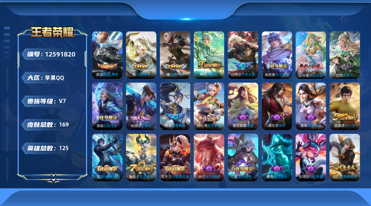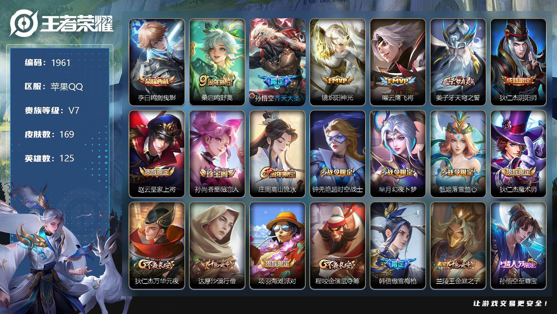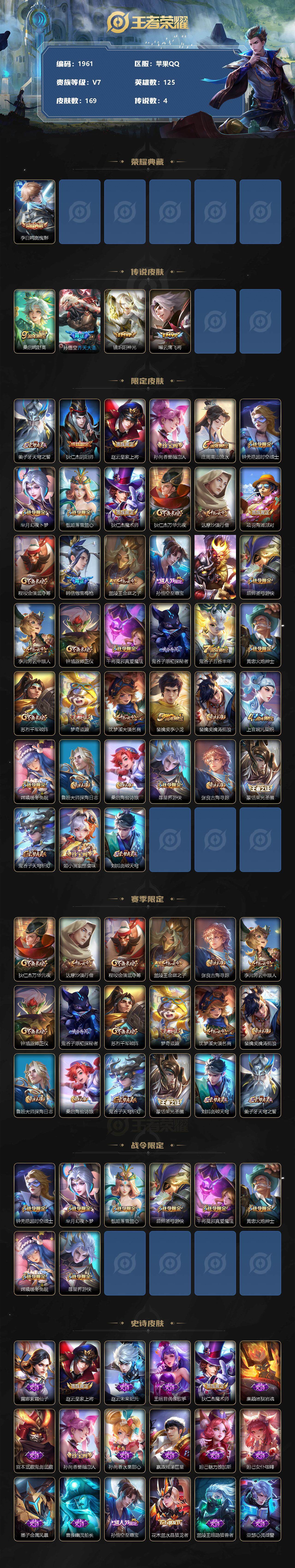 [12591820]苹果Q-V7-至尊星耀IV段位-125英雄-169皮肤-1典藏-0珍品无双-0无双-0珍品传说-4传说-42史诗