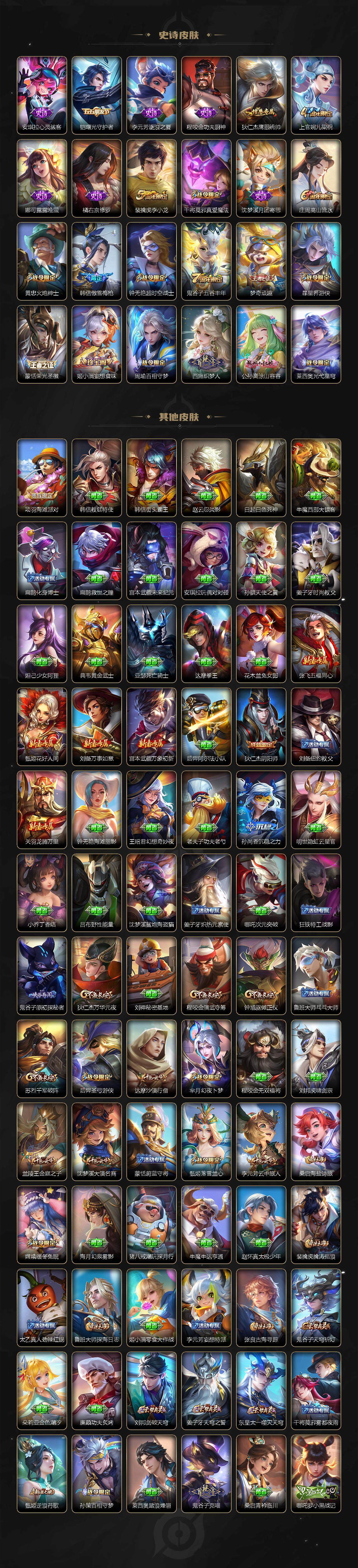 【史诗皮肤】:露娜紫霞仙子,赵云皇家上将,赵云未来纪元,王昭君偶像歌手,狄仁杰魔术师,廉颇地狱岩魂,宫本武藏鬼剑武藏,孙尚香蔷薇恋人,孙尚香水果甜心,嬴政摇滚巨星,妲己魅力维加斯,妲己女仆咖啡,墨子金属风暴,曹操幽灵船长,孙悟空至尊宝,花木兰水晶猎龙者,兰陵王暗隐猎兽者,亚瑟心灵战警,安琪拉心灵骇客,铠曙光守护者,李元芳逐浪之夏,程咬金功夫厨神,狄仁杰鹰眼统帅,上官婉儿梁祝,娜可露露晚萤,橘右京修罗,裴擒虎李小龙,干将莫邪真爱魔法,沈梦溪月团寄思,庄周高山流水,黄忠火炮绅士,韩信傲雪梅枪,钟无艳超时空战士,鬼谷子五谷丰年,梦奇顽趣,暃星界游侠,蒙恬荣光圣徽,姬小满妄想食味,周瑜百相守梦,西施织梦人,公孙离涂山容容,莱西奥光弋星穹