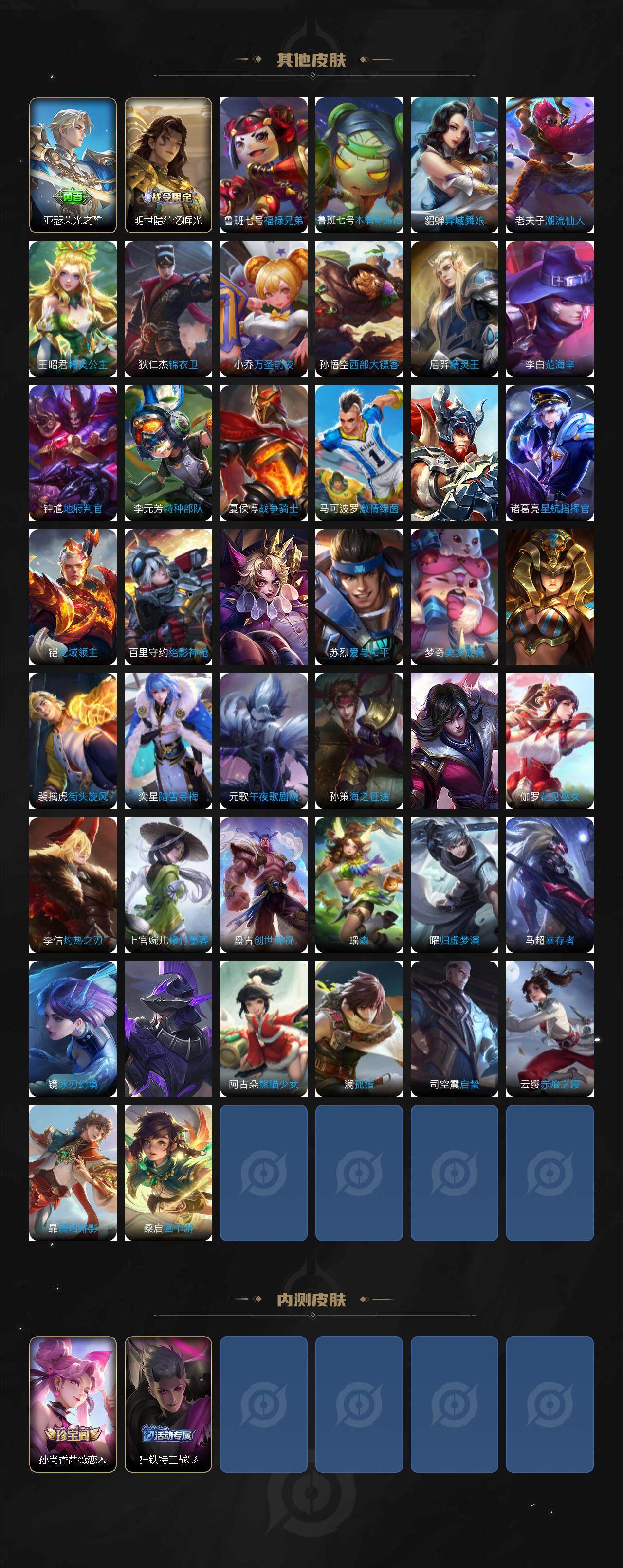 【赛季限定】:狄仁杰万华元夜,达摩沙漠行僧,程咬金演武夺筹,兰陵王金庭之子,张良古海寻踪,李元芳云中旅人,钟馗驱傩正仪,鬼谷子原初探秘者,苏烈千军破阵,梦奇顽趣,沈梦溪大漠名商,裴擒虎擒涛扼浪,鲁班大师探海日志,桑启海盐诗旅,鬼谷子天穹祈灯,蒙恬荣光圣徽,刘邦剑破天穹,姜子牙天穹之誓