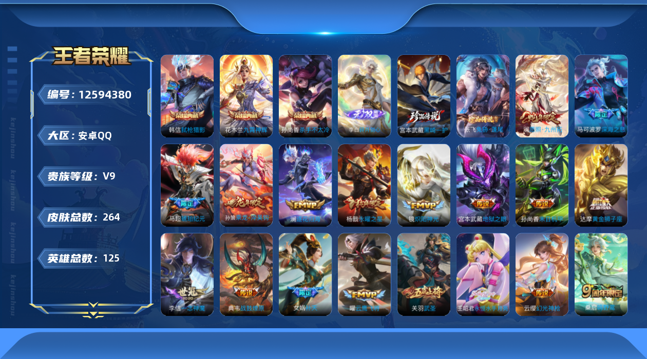 [12594380]安卓Q-V9-最强王者段位-124英雄-263皮肤-3典藏-0珍品无双-1无双-2珍品传说-26传说-82史诗 【荣耀典藏】:孙尚香杀手不太冷,花木兰九霄神辉,韩信弑枪猎影 【无双皮肤】:李白碎月剑心 【珍品传说】:张飞兔狲蓬尾,宫本武藏黑崎一护 【传说皮肤】:澜愿照九州拓,云缨幻光神枪,桑启鸣野蒿,典韦战鼓燎原,孙策乘龙淬吴钩,马超琥珀纪元,澜逐花归海,王昭君永恒水手月亮,兰陵王影龙天霄,宫本武藏惊梅引,花木兰燃星之曲,马可波罗深海之息,女娲补天,孙策末日机甲,赵云淬星耀世,铠绛天战甲,镜炽阳神光,虞姬启明星使,关羽武圣,曜云鹰飞将,李信一念神魔,刘备时之恋人,达摩黄金狮子座,杨戬永曜之星,孙尚香末日机甲,宫本武藏地狱之眼 【限定皮肤】:姜子牙天穹之誓,狄仁杰阴阳师,赵云皇家上将,扁鹊奇幻香踪,吕布御风骁将,典韦岱宗,马可波罗深海之息,狄仁杰魔术师,项羽海滩派对,关羽武圣,关羽百相守梦,兰陵王影龙天霄,花木兰默契交锋,花木兰燃星之曲,牛魔奔雷神使,虞姬启明星使,杨戬永曜之星,杨戬潮玩骑兵,女娲补天,哪吒逐梦之翼,雅典娜单词大作战,雅典娜黎明之约,苏烈玄武志,沈梦溪匿光破解者,裴擒虎擒涛扼浪,云中君纤云弄巧,云中君时之祈愿,嫦娥暖冬兔眠,西施玲珑珍味,西施至美乘鲤谣,蒙犽狂想玩偶喵,鲁班大师探海日志,桑启海盐诗旅,暃星界游侠,戈娅驭风魔法,艾琳流音漫舞,司空震地狱燃心,阿古朵江河有灵,张良古海寻踪,王昭君永恒水手月亮,蒙犽百解令,高渐离燃音魔法,妲己灵卜魔法,鬼谷子天穹祈灯,李白碎月剑心,伽罗琥珀纪元,马超琥珀纪元,姬小满妄想食味,孙策乘龙淬吴钩,鲁班七号蔬乡物语,李元芳蔬乡物语,刘邦剑破天穹,程咬金群星魔术团 【年限皮肤】:苏烈玄武志,杨戬永曜之星,吕布御风骁将,牛魔奔雷神使,典韦岱宗,关羽武圣,孙策乘龙淬吴钩 【赛季限定】:张良古海寻踪,雅典娜黎明之约,裴擒虎擒涛扼浪,鲁班大师探海日志,桑启海盐诗旅,鬼谷子天穹祈灯,刘邦剑破天穹,姜子牙天穹之誓 【战令限定】:扁鹊奇幻香踪,艾琳流音漫舞,杨戬潮玩骑兵,雅典娜单词大作战,嫦娥暖冬兔眠,西施玲珑珍味,蒙犽狂想玩偶喵,司空震地狱燃心,暃星界游侠,戈娅驭风魔法,高渐离燃音魔法,妲己灵卜魔法,鲁班七号蔬乡物语,李元芳蔬乡物语 【史诗皮肤】:鲁班七号电玩小子,项羽苍穹之光,阿轲暗夜猫娘,赵云皇家上将,赵云未来纪元,貂蝉圣诞